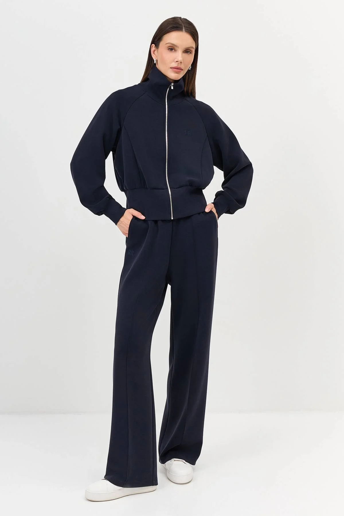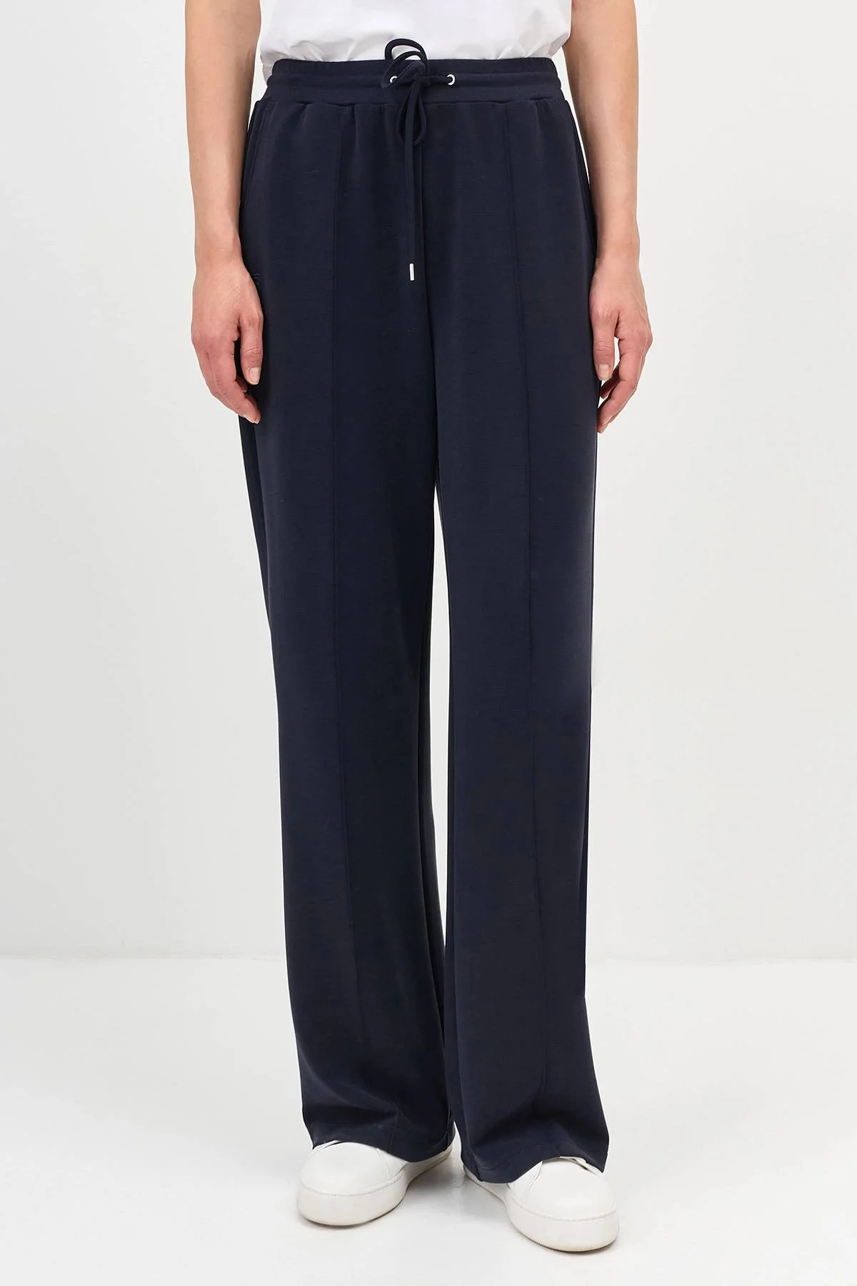 Прямые трикотажные брюки с застроченными стрелками. Резинка и шнурок по линии талии. Боковые карманы в швах. В составе модал.