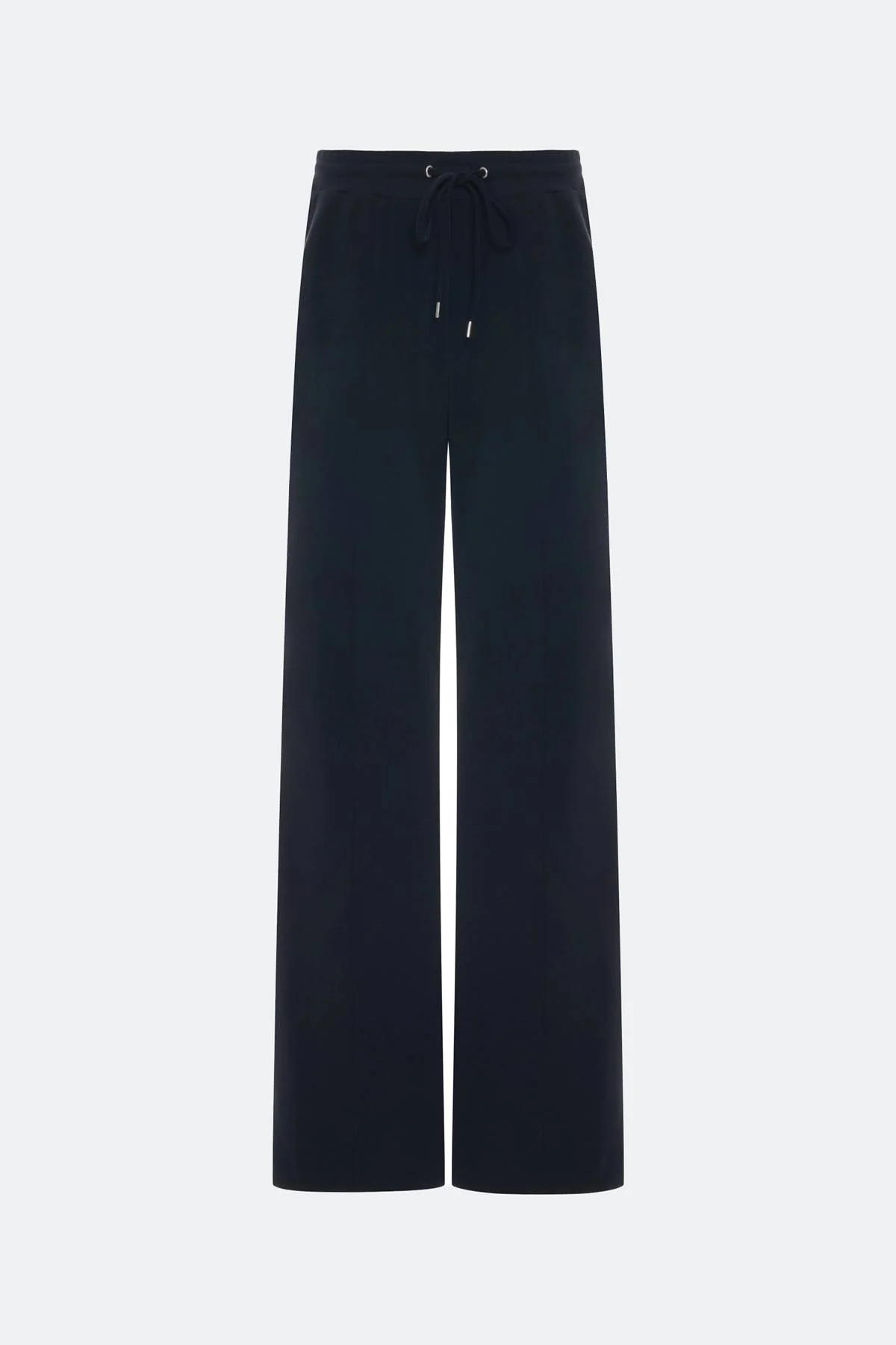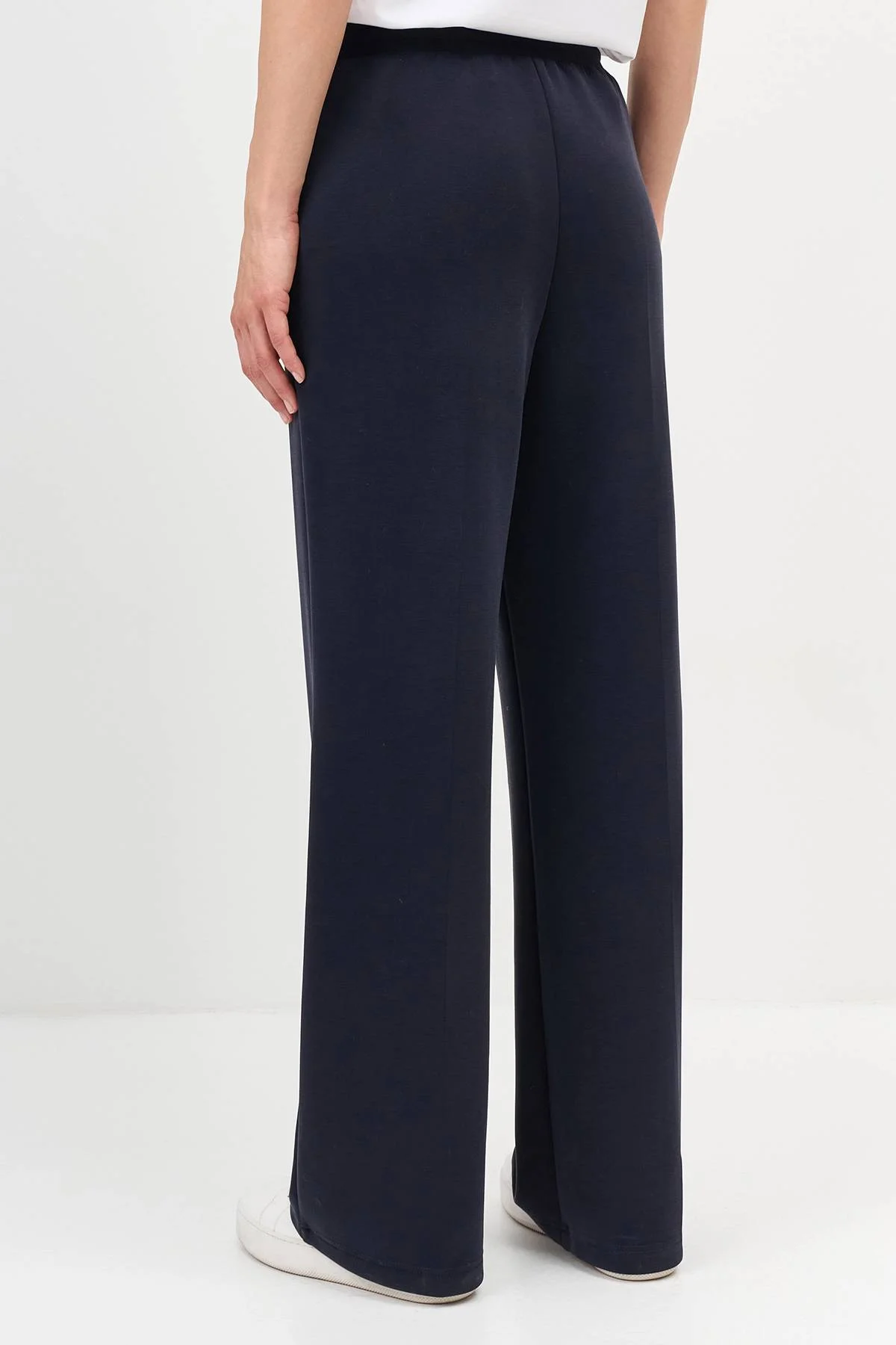 Прямые трикотажные брюки с застроченными стрелками. Резинка и шнурок по линии талии. Боковые карманы в швах. В составе модал.