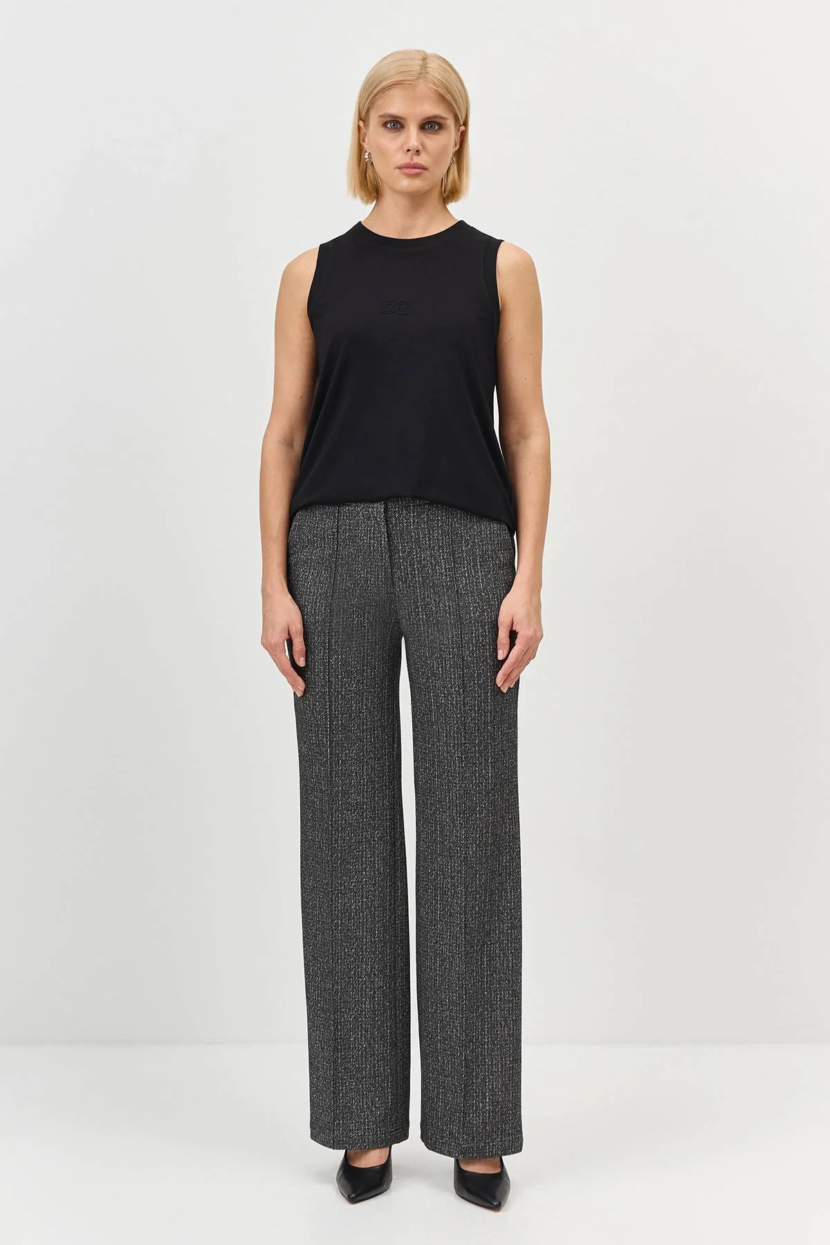 Широкие трикотажные брюки с застроченными стрелками. Свободный силуэт. Застежка на молнию и пуговицу. Резинка по линии талии сзади. Боковые карманы в швах. В составе вискоза и спандекс.