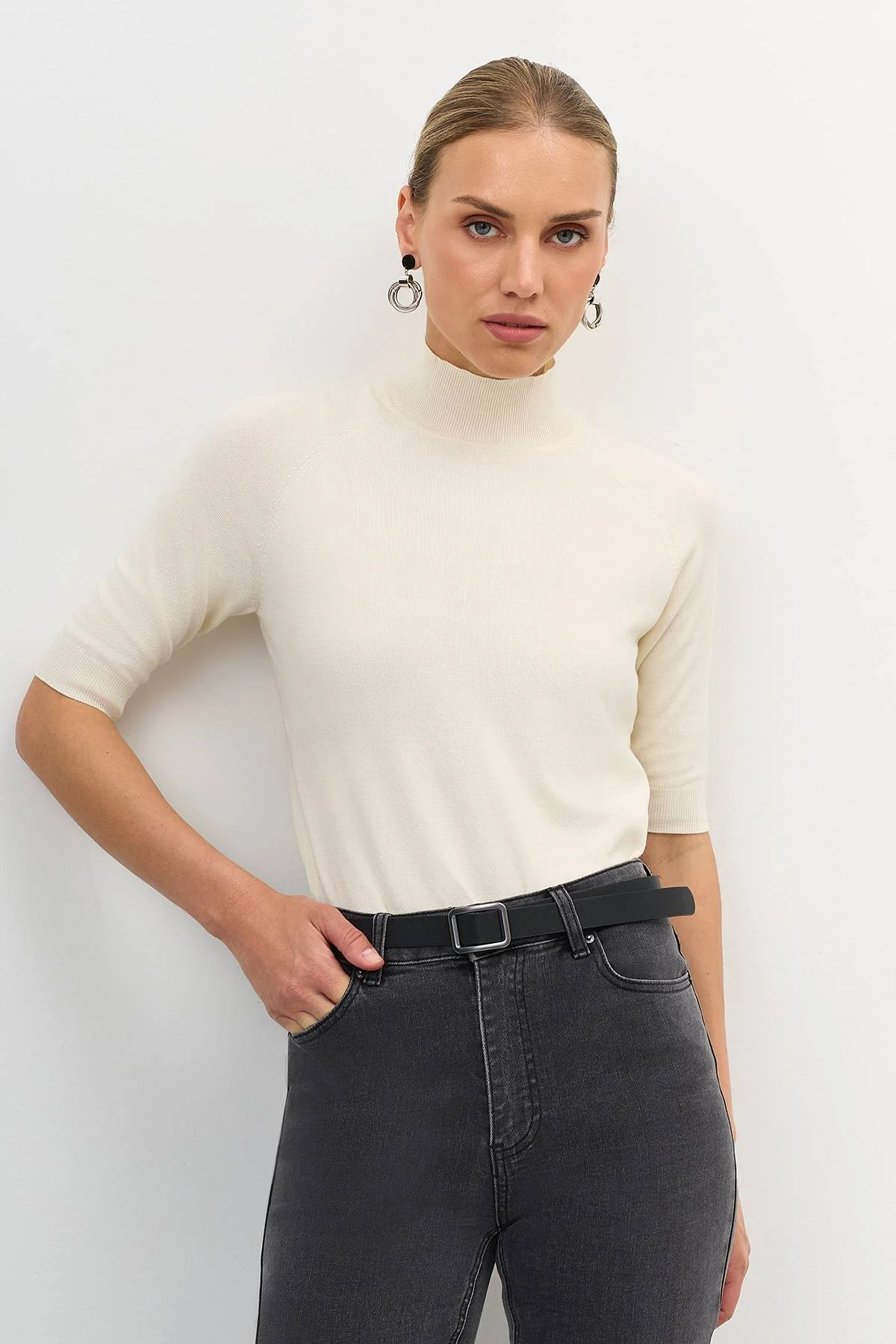 Приталенный силуэт с аккуратным воротником стойка создает лаконичный повседневный образ. Мягкая вискозная вязка обеспечивает комфорт и приятные тактильные ощущения. Укороченные рукава делают модель идеальной для межсезонья.