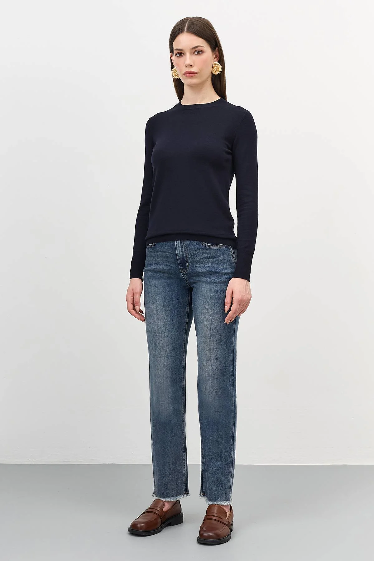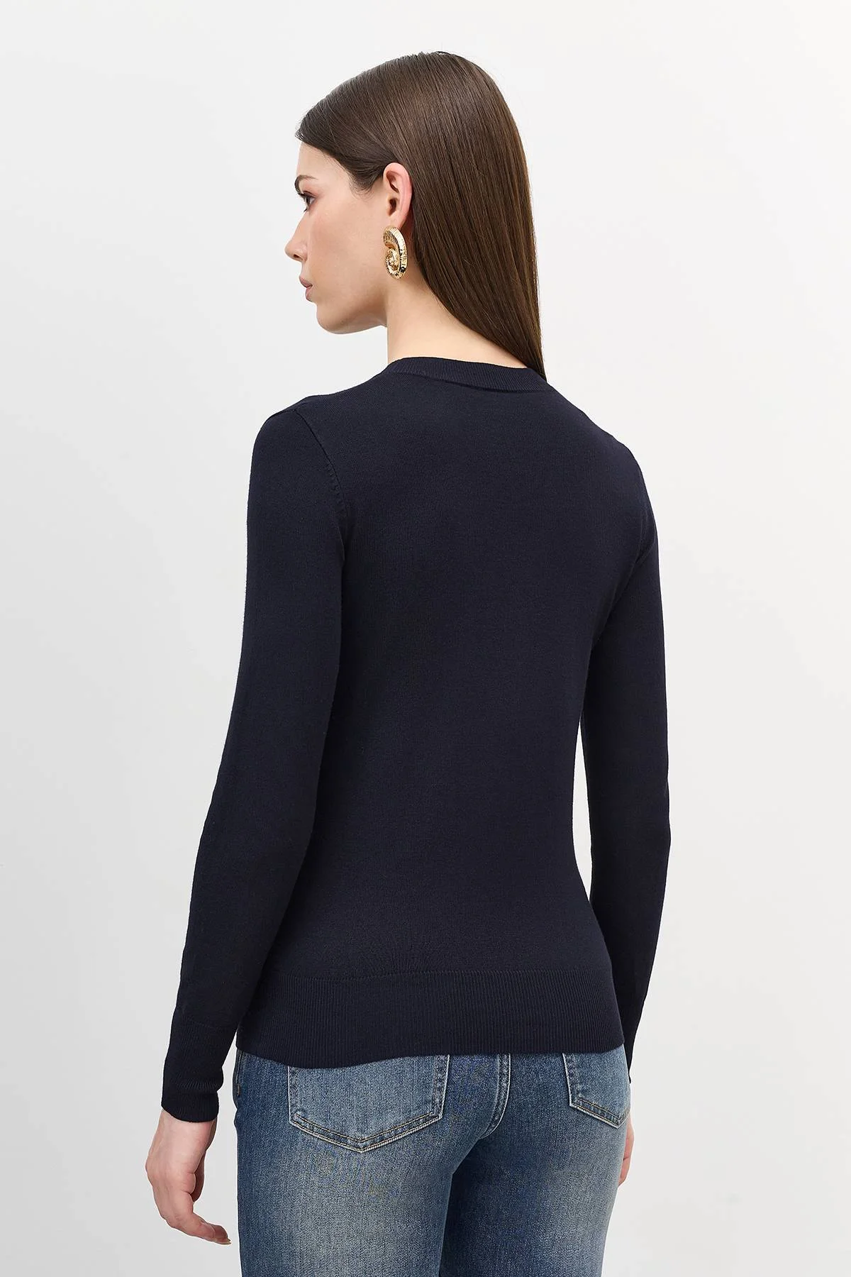Базовый джемпер из вискозной пряжи с добавлением нейлона. Прямой силуэт. Воротник небольшая стойка. Втачные рукава. Манжеты по низу рукавов и изделия.