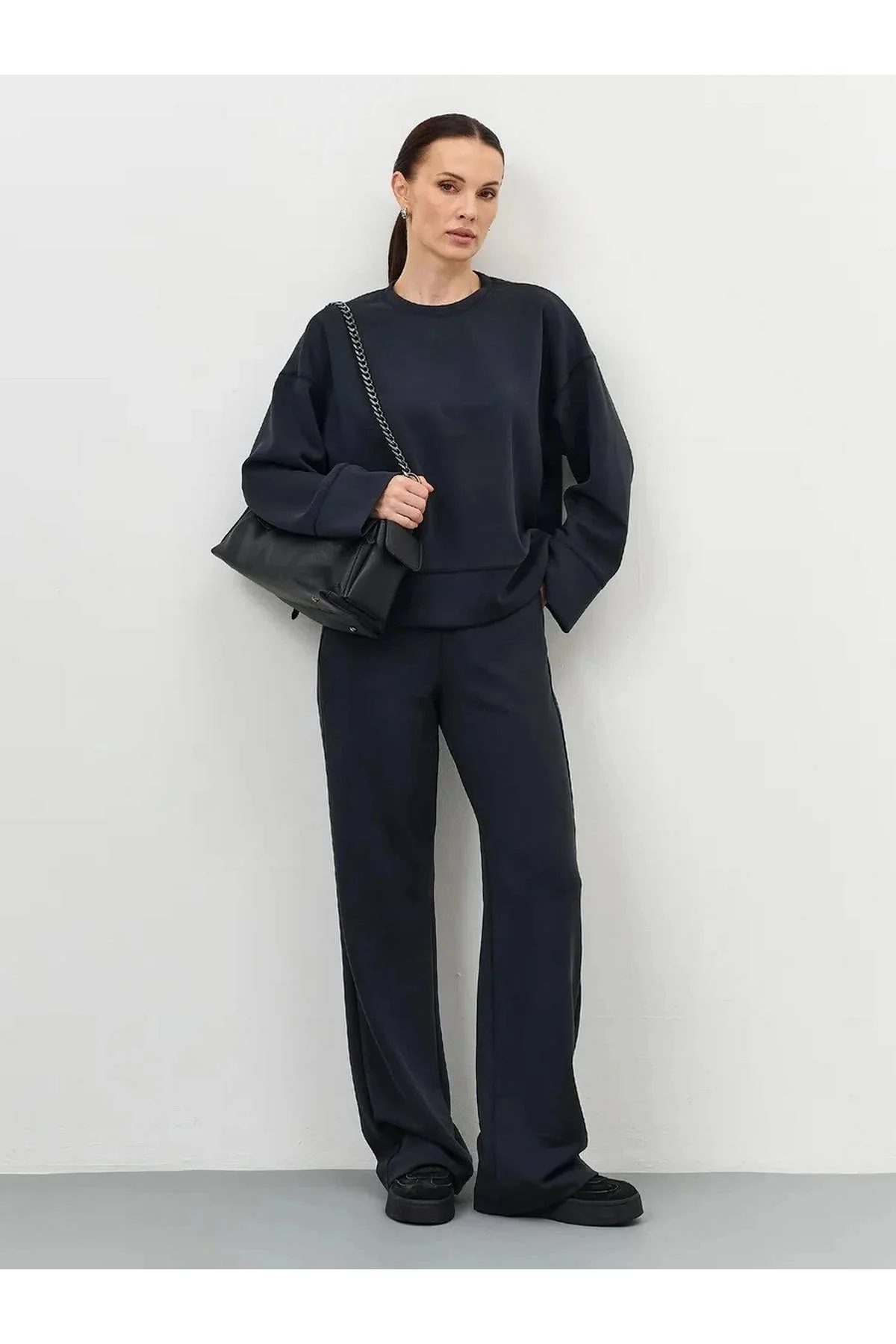 Трикотажный свитшот из смесового модала. Круглый вырез. Свободный силуэт. Спущенная линия плеч. Акцентный риб с декоративной отстрочкой по низу рукавов и изделия. Комплект с арт. 60803.