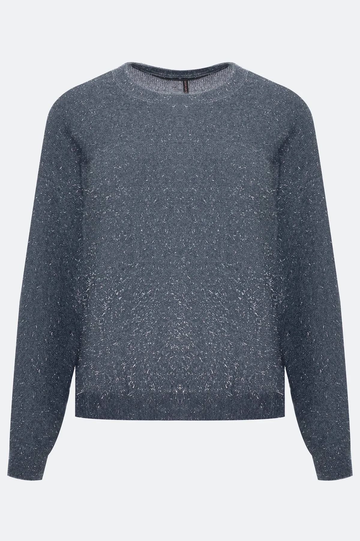 Свободный джемпер из фасонной мерцающей пряжи-травки. Спущенная линия плеч. Круглый вырез. Манжеты по низу рукавов и изделия.