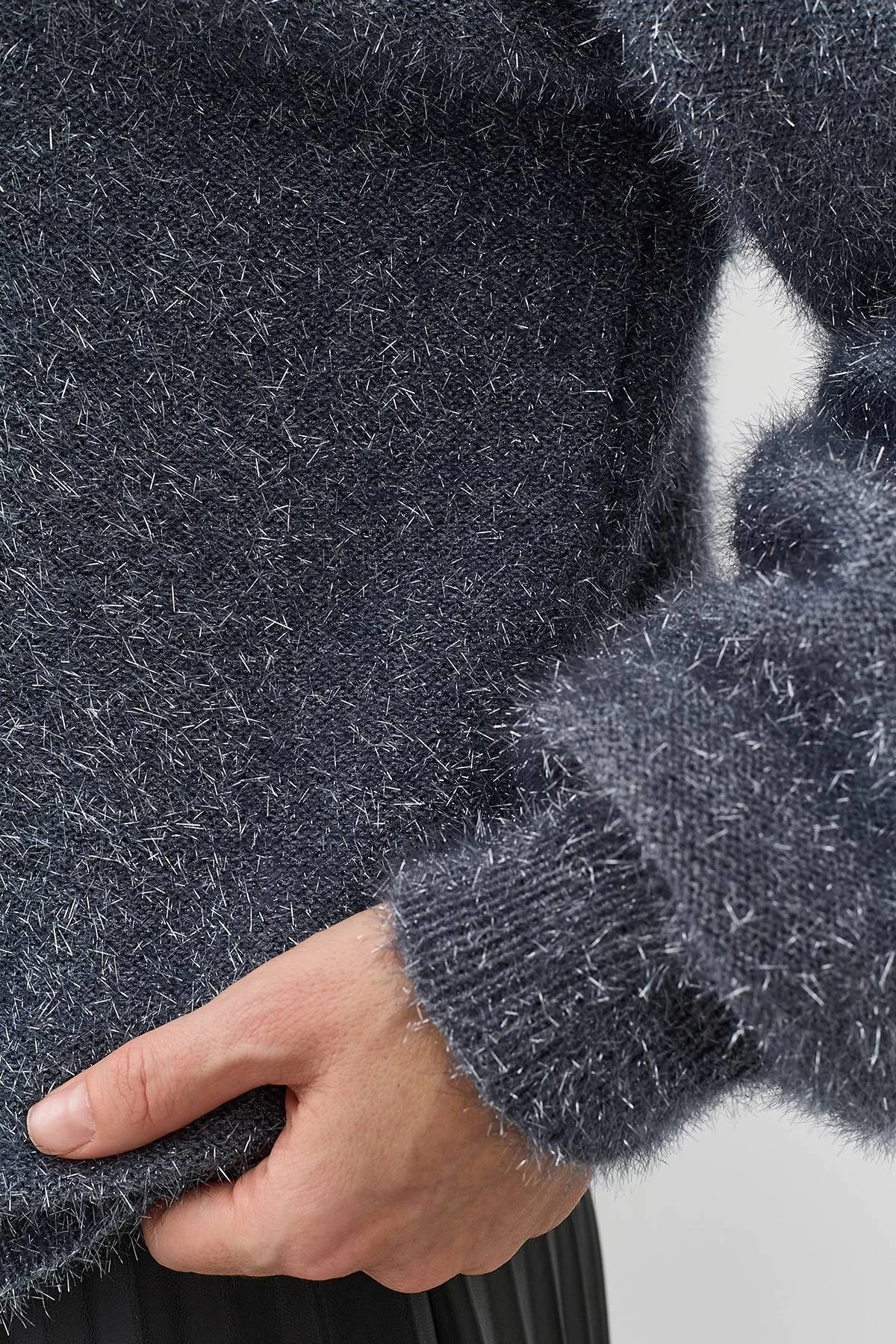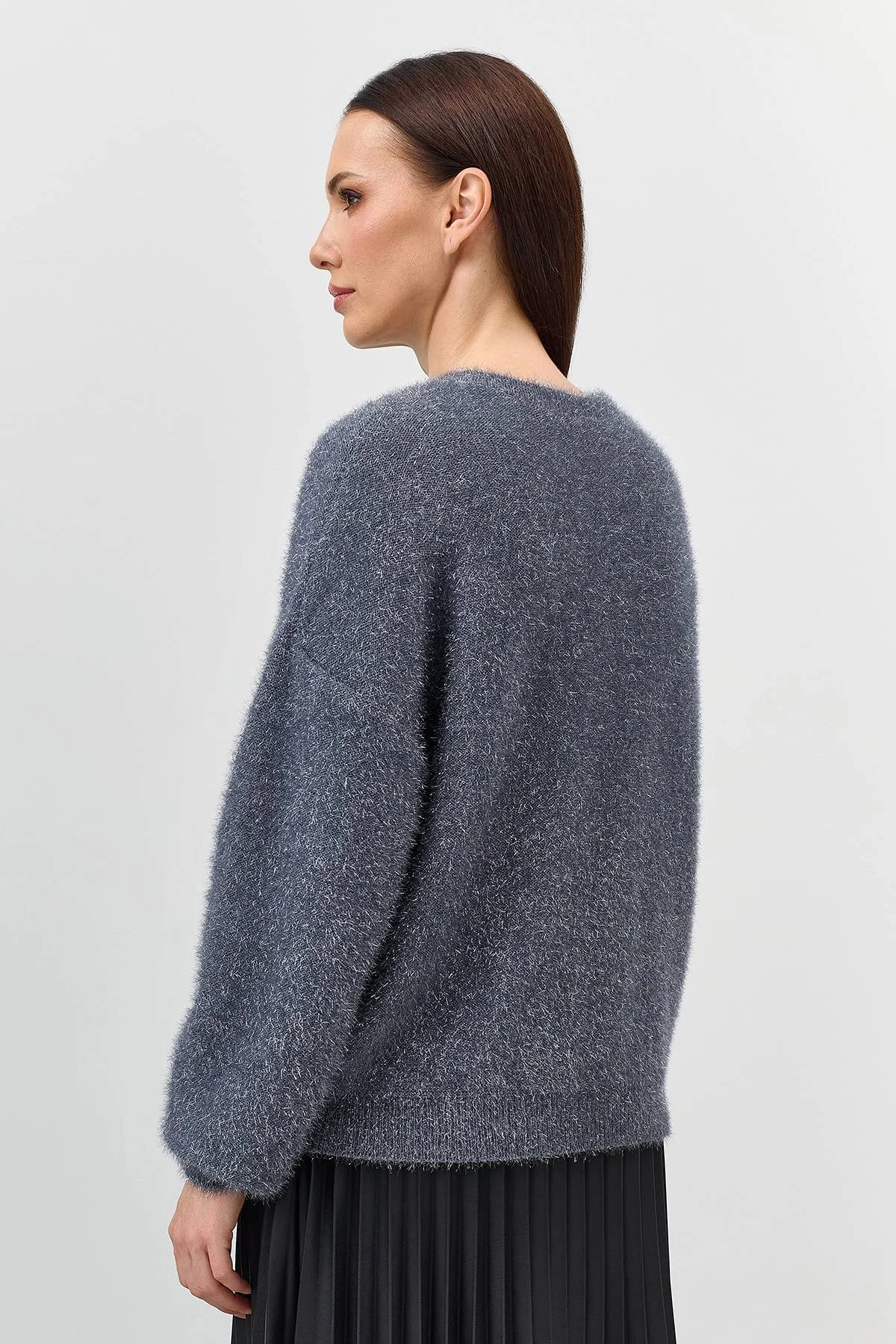 Свободный джемпер из фасонной мерцающей пряжи-травки. Спущенная линия плеч. Круглый вырез. Манжеты по низу рукавов и изделия.