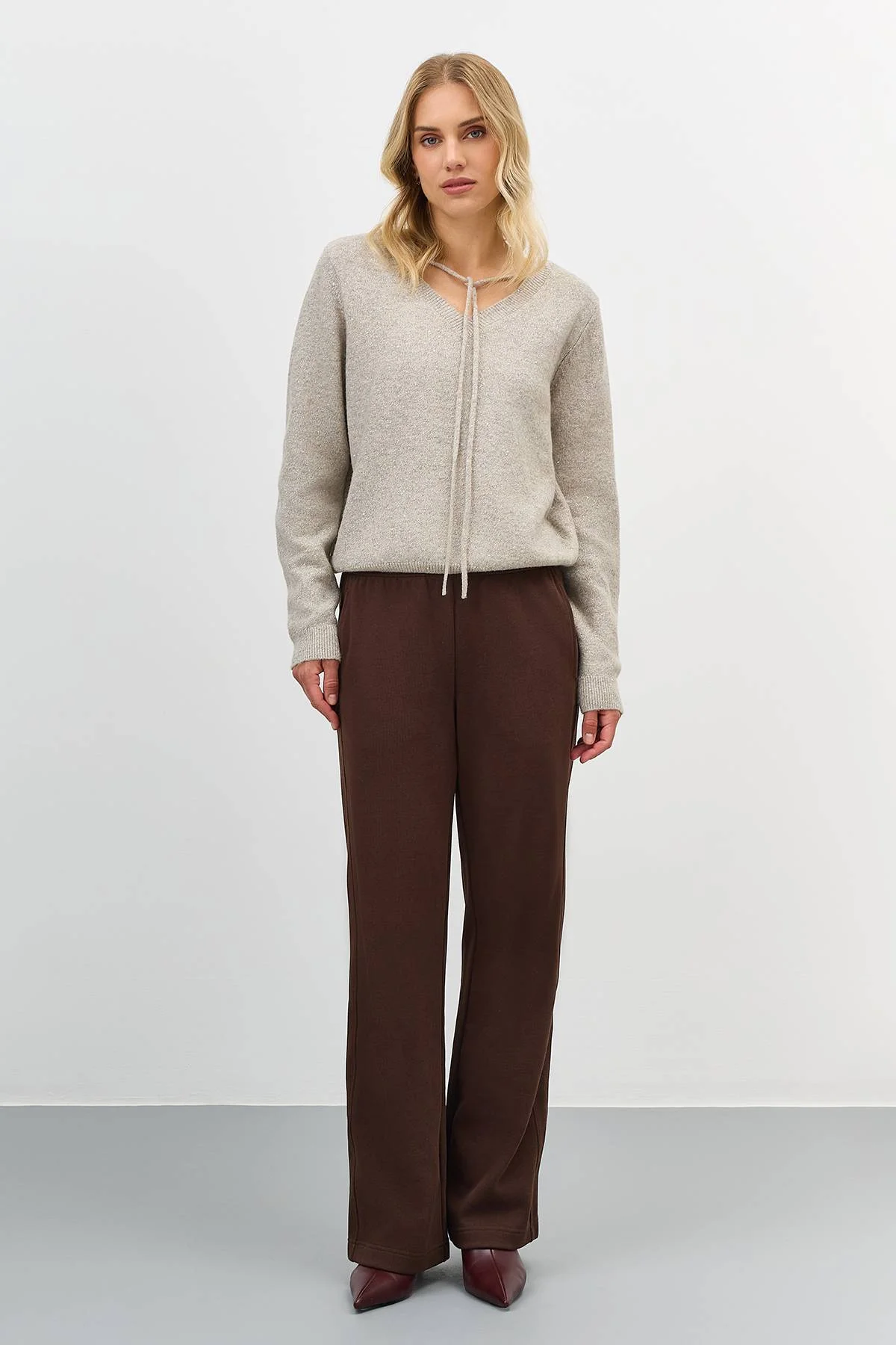 Двусторонний джемпер с мерцающим люрексом и деликатными пайетками. Свободный силуэт. Спущенная линия плеча. Можно носить на обе стороны и менять круглый вырез на V-образный с декоративной тесьмой.