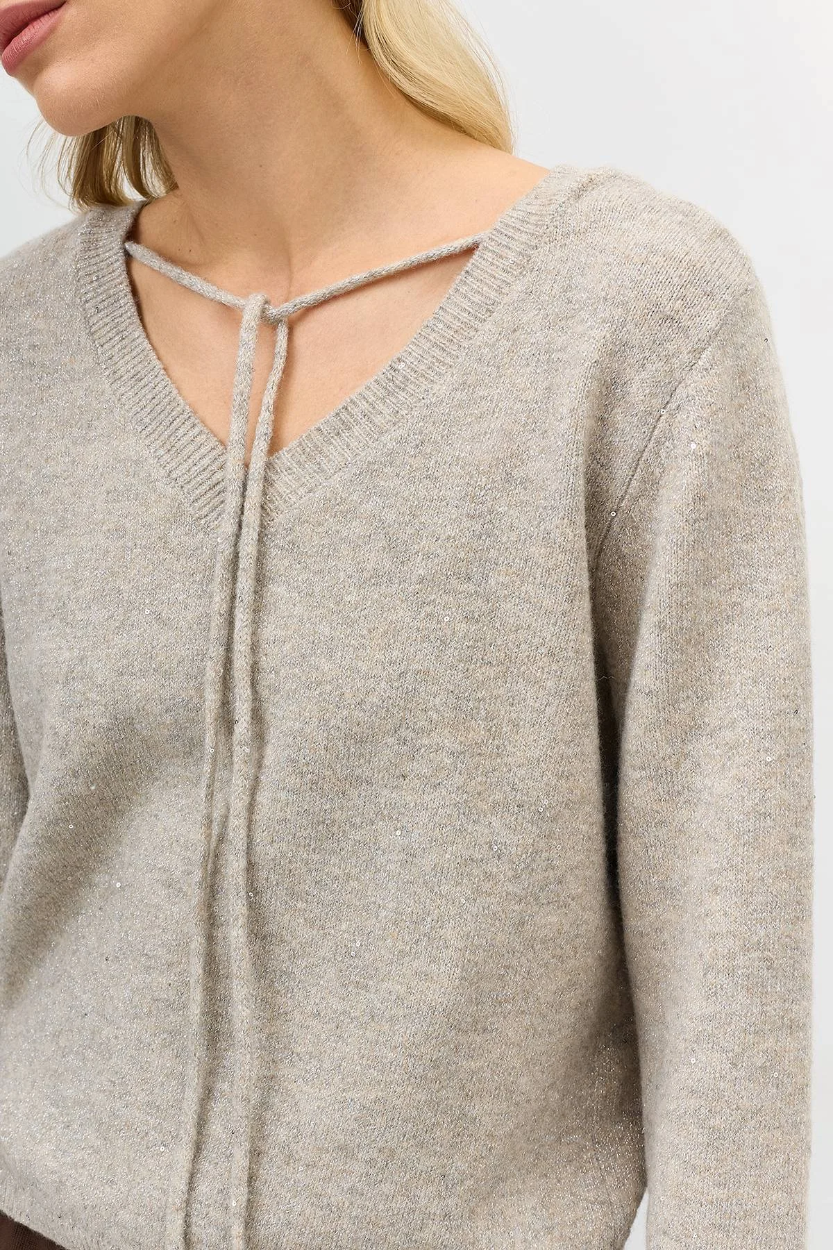 Двусторонний джемпер с мерцающим люрексом и деликатными пайетками. Свободный силуэт. Спущенная линия плеча. Можно носить на обе стороны и менять круглый вырез на V-образный с декоративной тесьмой.