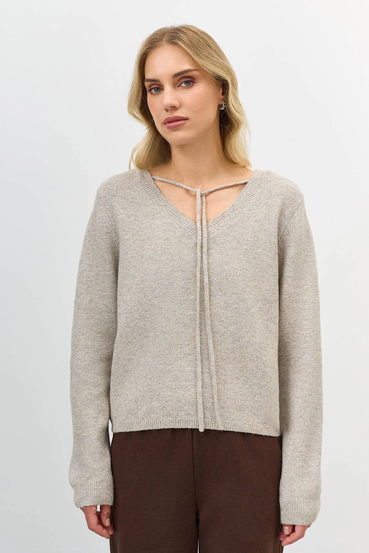 Двусторонний джемпер с мерцающим люрексом и деликатными пайетками. Свободный силуэт. Спущенная линия плеча. Можно носить на обе стороны и менять круглый вырез на V-образный с декоративной тесьмой.