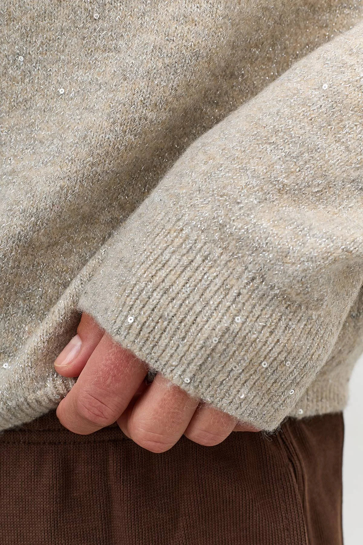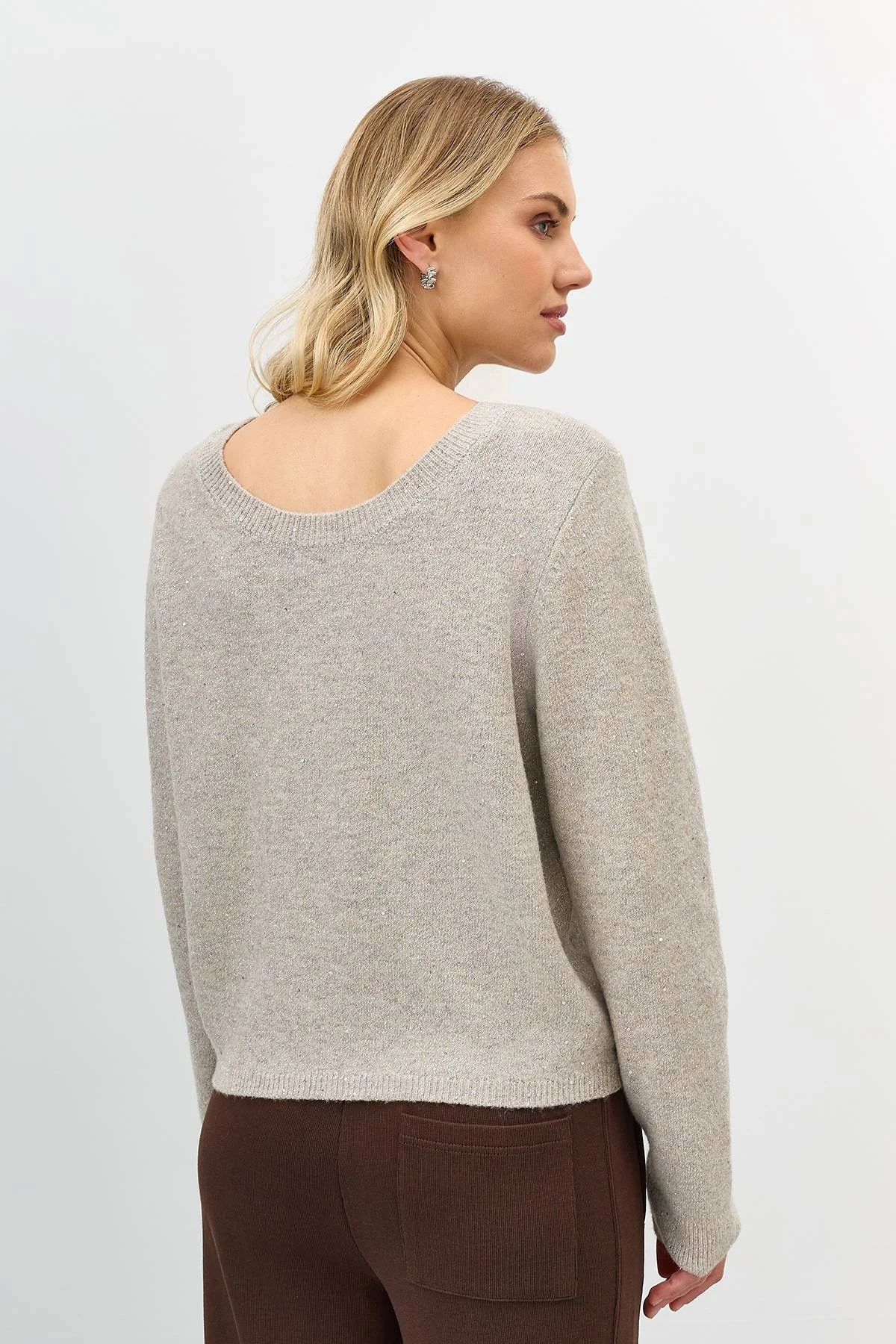 Двусторонний джемпер с мерцающим люрексом и деликатными пайетками. Свободный силуэт. Спущенная линия плеча. Можно носить на обе стороны и менять круглый вырез на V-образный с декоративной тесьмой.