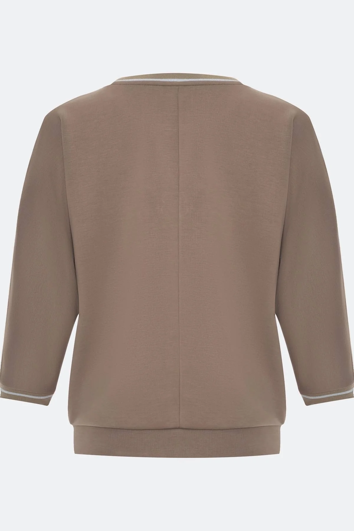 Трикотажный джемпер свободного силуэта с минималистичной вышивкой в цвет ткани. Круглый вырез. Контрастный риб с деликатным люрексом по горловине и низу укороченных рукавов. В составе модал.