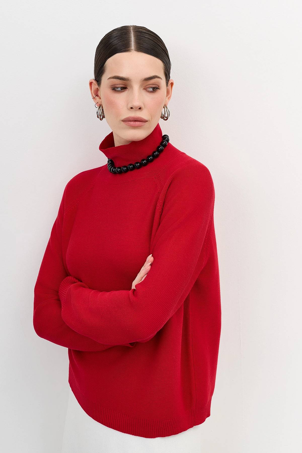 Вязаный джемпер с высоким воротником стойкой. Свободный силуэт. Свободные рукава реглан с манжетами по низу. В составе хлопок.