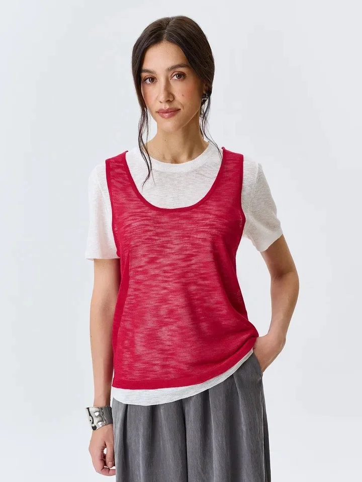 Джемпер имеет прямой силуэт, круглый вырез и короткие втачные рукава, создавая универсальный и удобный образ. В комплекте идет яркий съемный топ с глубоким круглым вырезом и широкими бретелями, который можно носить как самостоятельно, так и в сочетании с джемпером. Этот дуэт идеально подойдет как для летних прогулок, так и для создания стильных образов на весну. Тонкая вязка джемпера придает ему воздушность и элегантность, а яркий топ добавит нотку игривости и свежести.