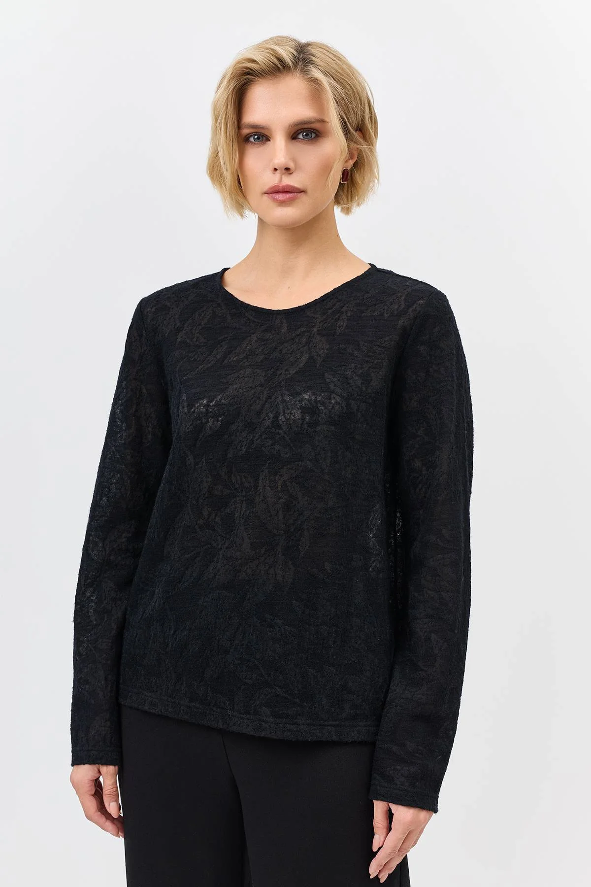 Полупрозрачный ажурный лонгслив из смесовой шерсти. Прямой силуэт. Круглый вырез. Деликатные разрезы в боковых швах. В комплекте с палантином LSZ27-636-16.