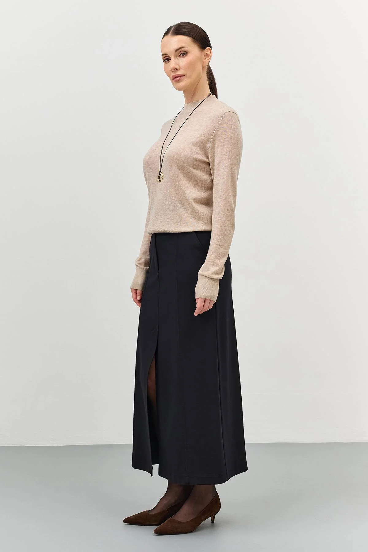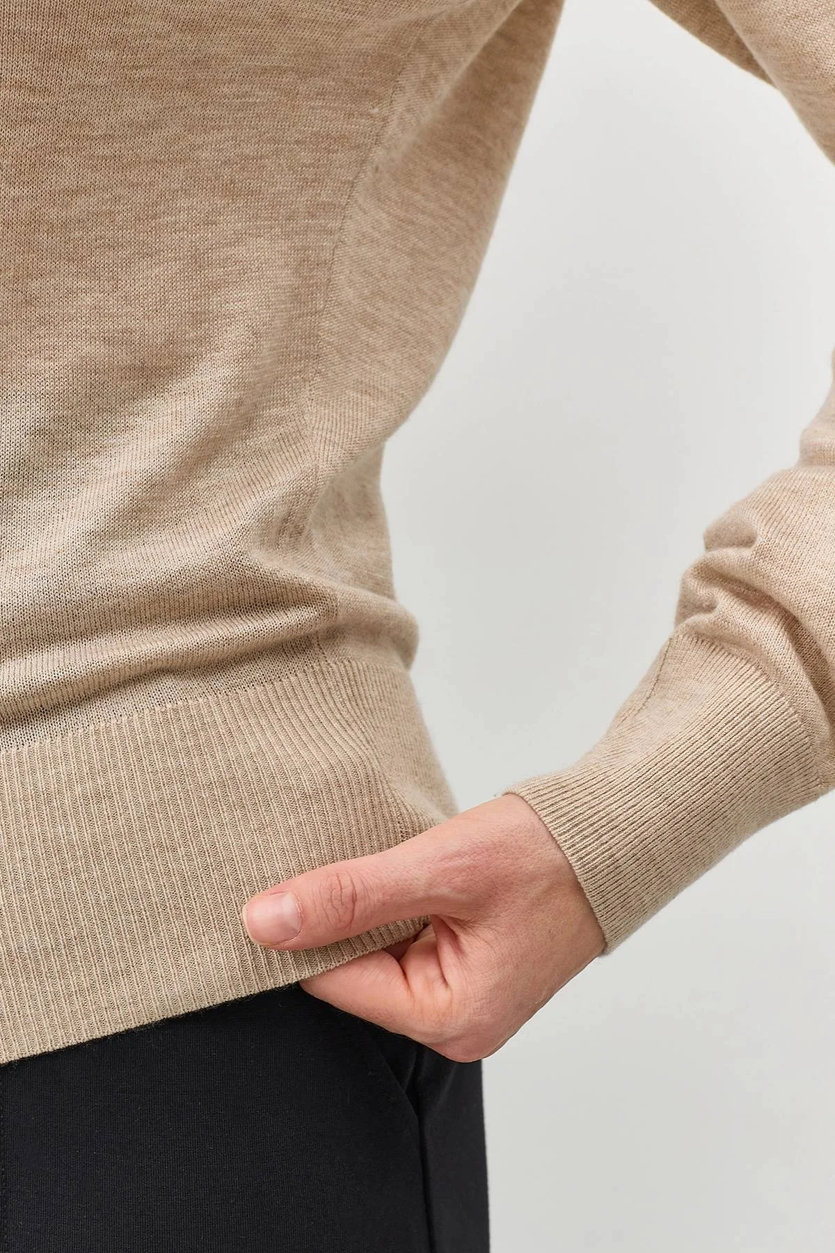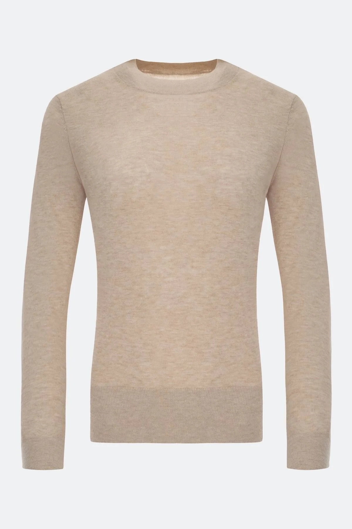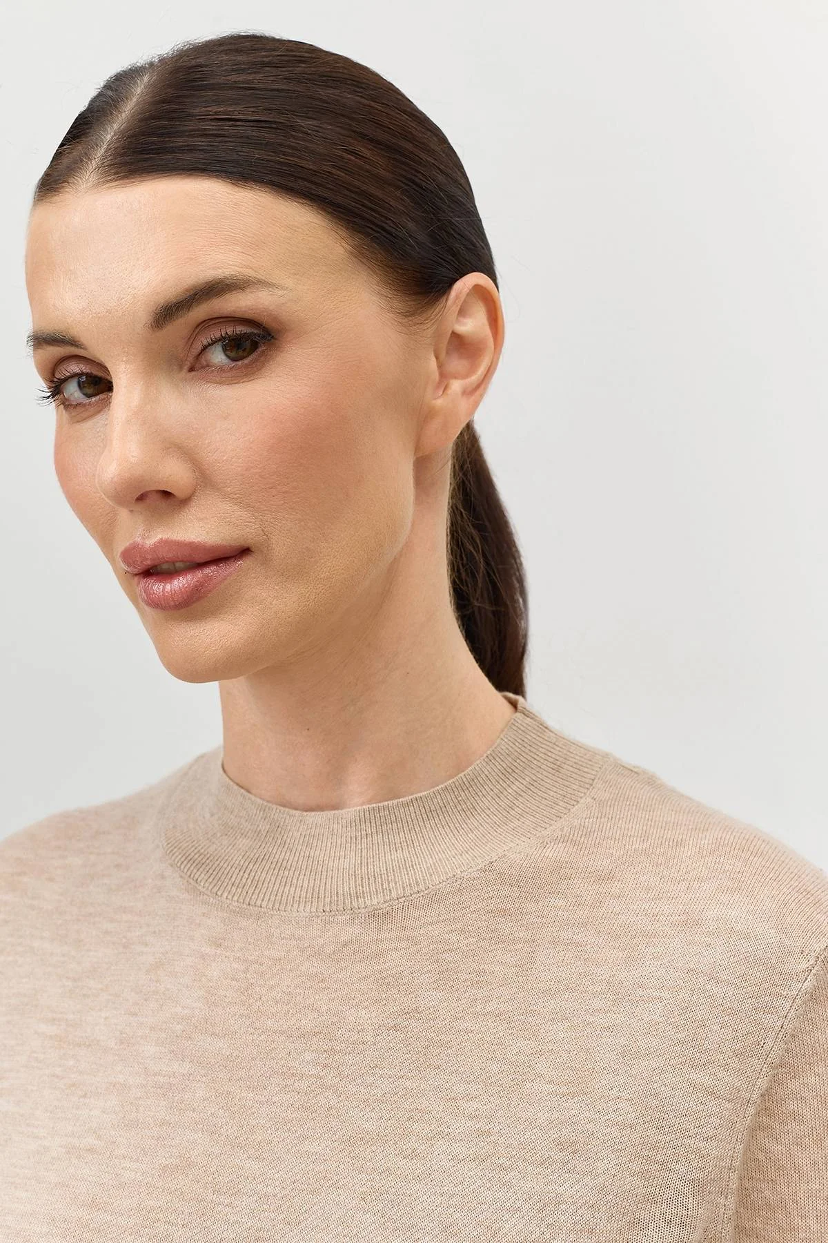 Тонкий вязаный джемпер с шерстью и шелком в составе. Полуприталенный силуэт. Круглый вырез. Широкая резинка по низу. В комплекте с палантином LG34-439-01.