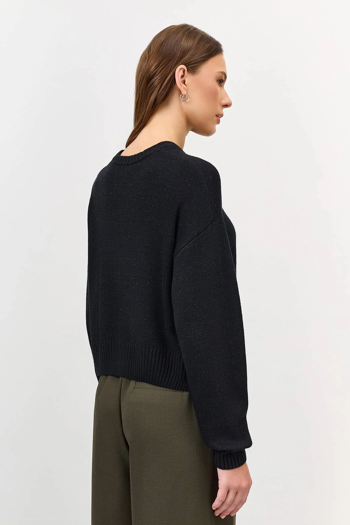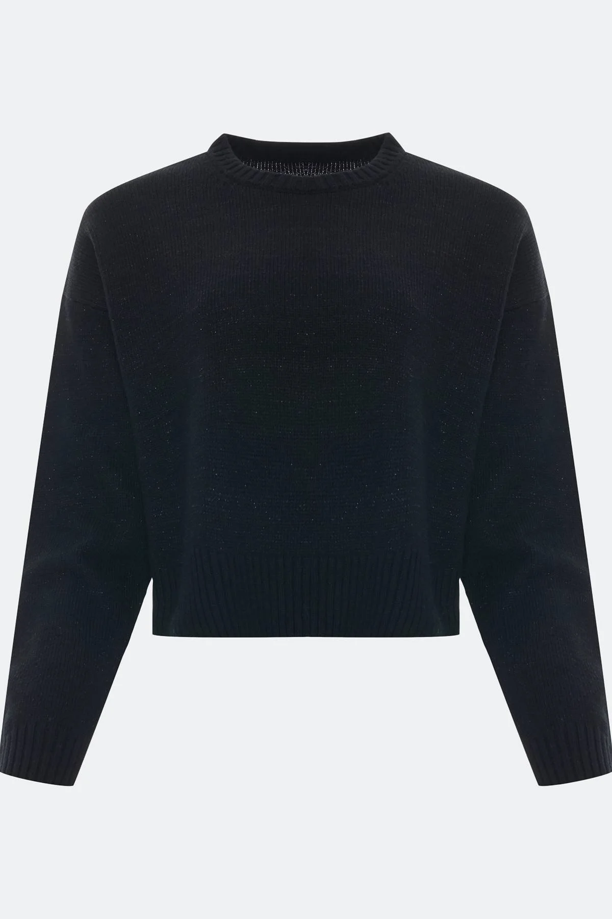 Укороченный джемпер с ангорой и вискозой в составе. Свободный силуэт. Круглый вырез. Дополнен деликатным люрексом. Манжеты по горловине, низу изделия и рукавов. В комплекте с палантином LBL19-856-12.
