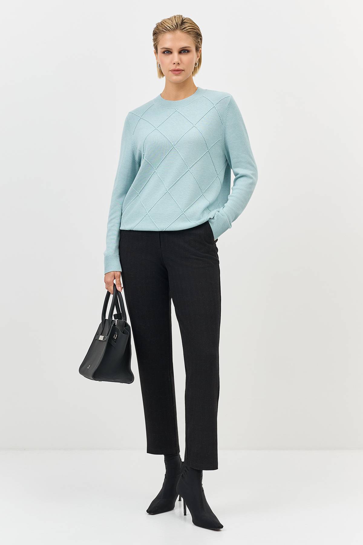 джемпер фактурной вязки с узором ромбы и деликатными пайетками. Прямой силуэт. Круглый вырез. Длинные втачные рукава. В составе вискоза и кашемир.