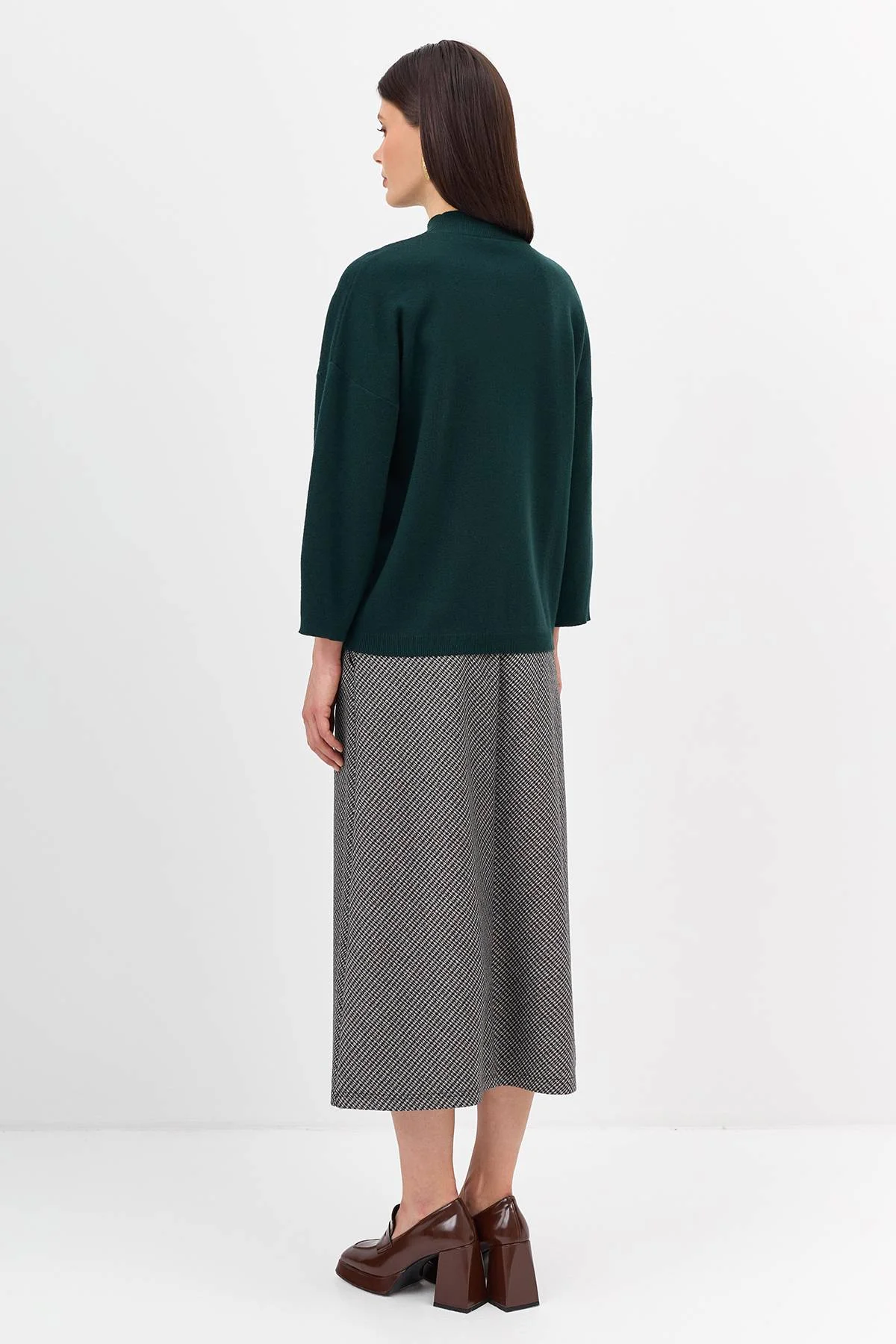 Вязаный джемпер глубокого изумрудного цвета с кашемиром в составе. Свободный силуэт. Воротник стойка. Укороченные рукава. Дополнен накладным карманом с мерцающим подзором. В комплекте с палантином LBL54-645-01.
