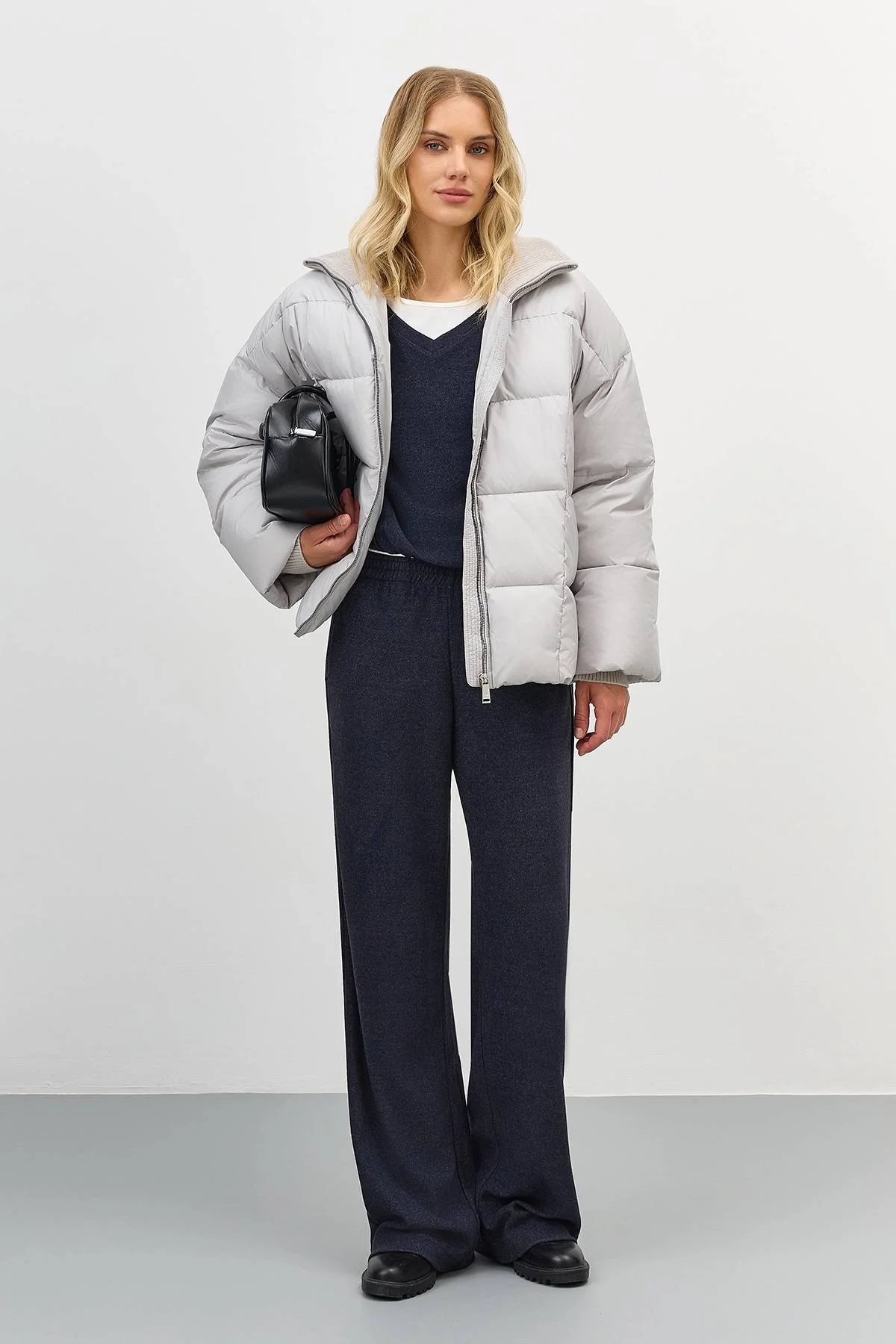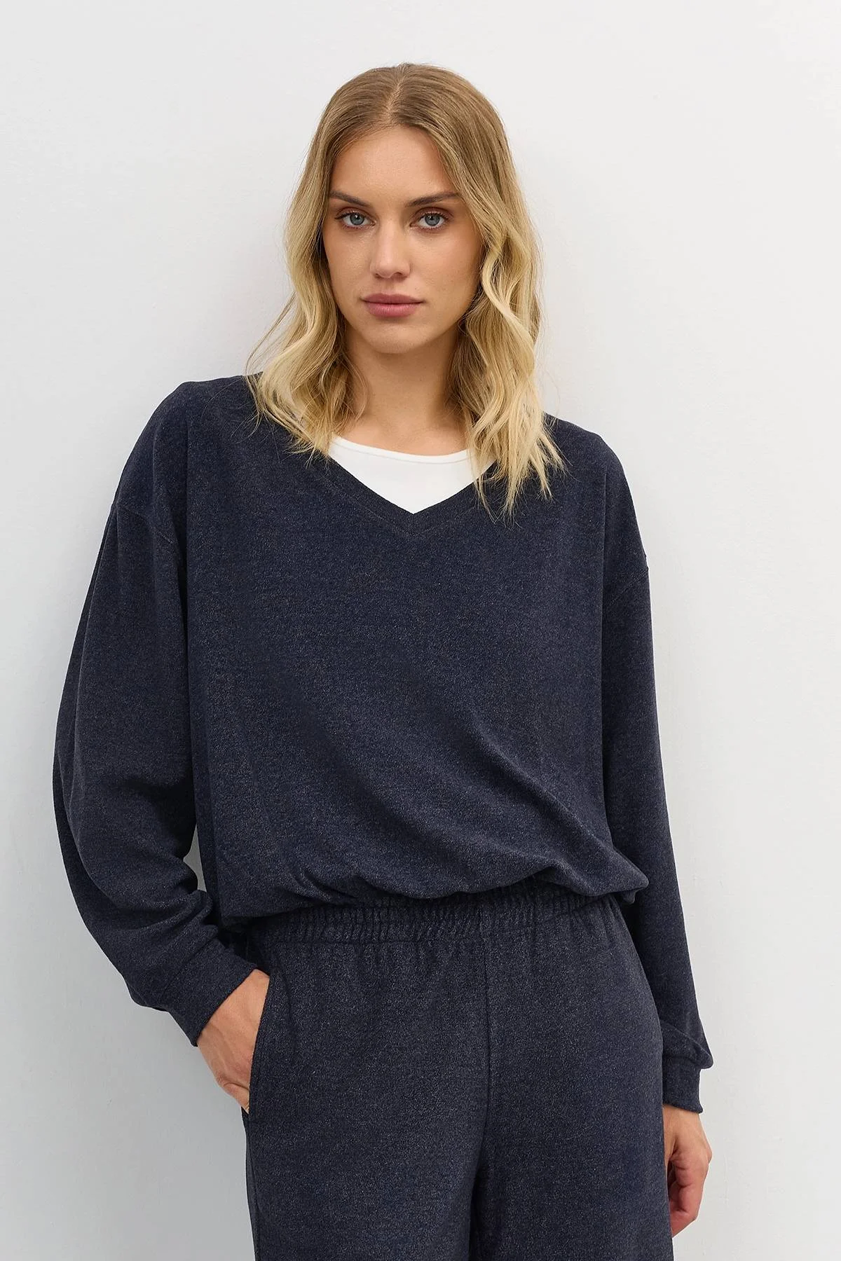 Комбинированный джемпер из фактурного трикотажа с имитацией многослойности. Свободный силуэт. Спущенная линия плеч. V-образный вырез. Резинка и дополнительный объем по низу изделия. В составе вискоза и нейлон. Подкладка имитирующая топ из хлопка.