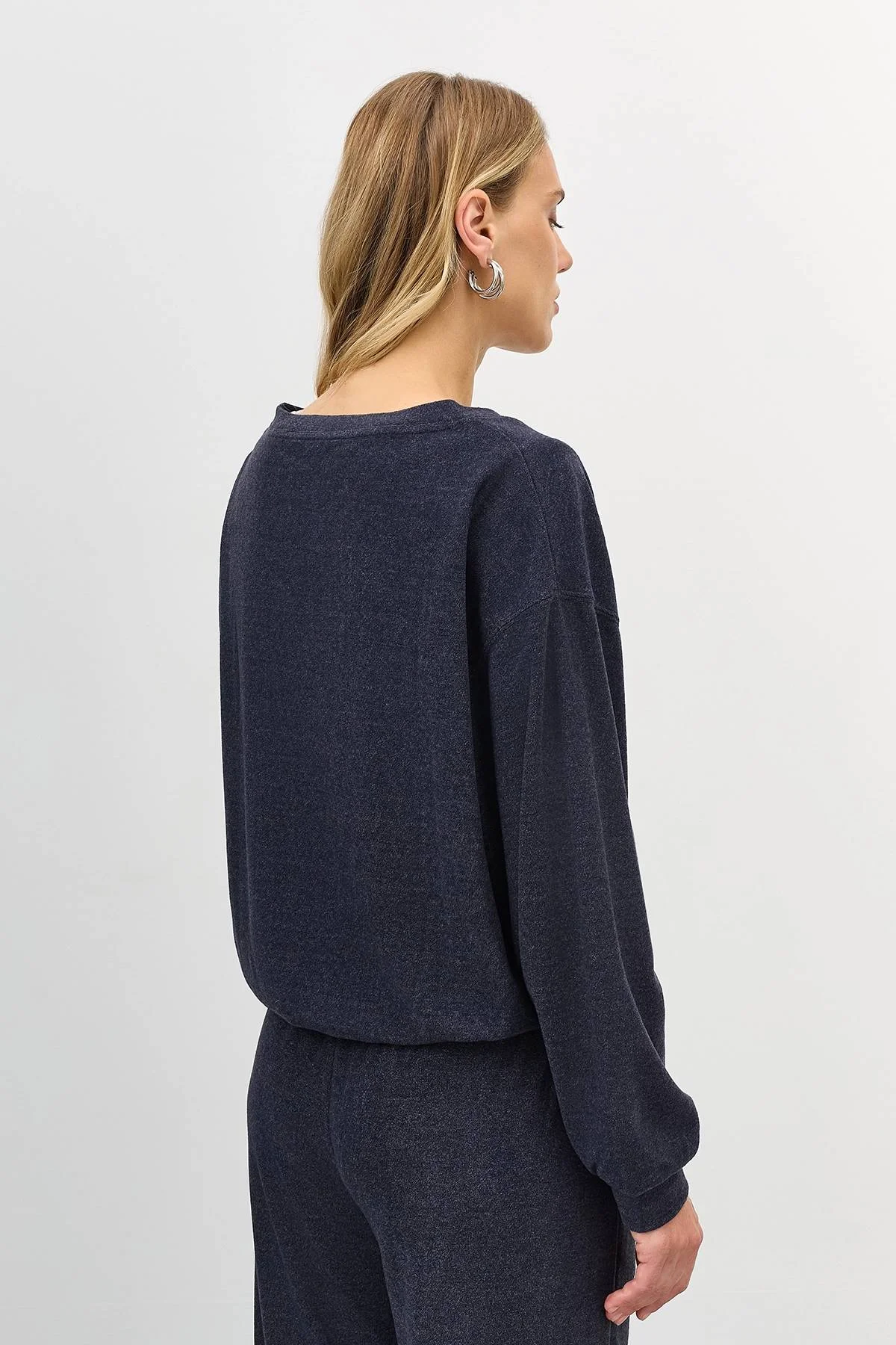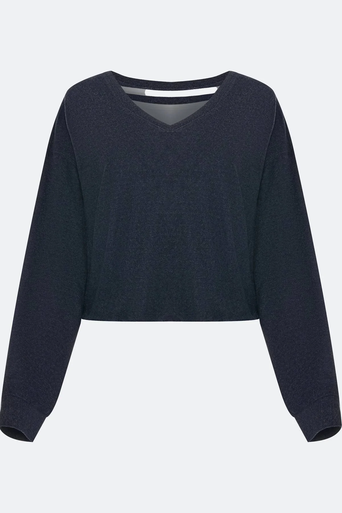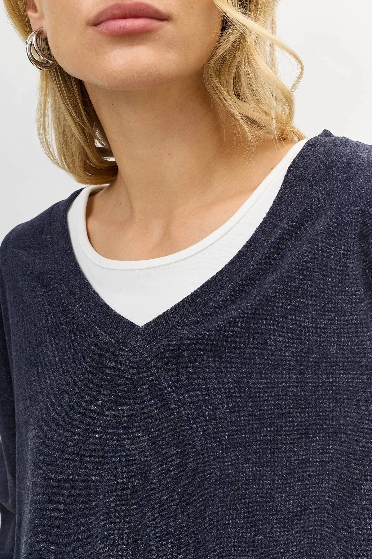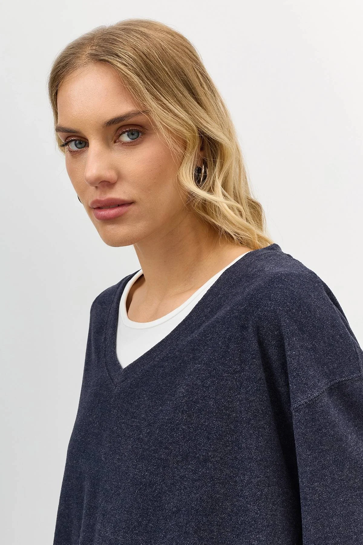 Комбинированный джемпер из фактурного трикотажа с имитацией многослойности. Свободный силуэт. Спущенная линия плеч. V-образный вырез. Резинка и дополнительный объем по низу изделия. В составе вискоза и нейлон. Подкладка имитирующая топ из хлопка.