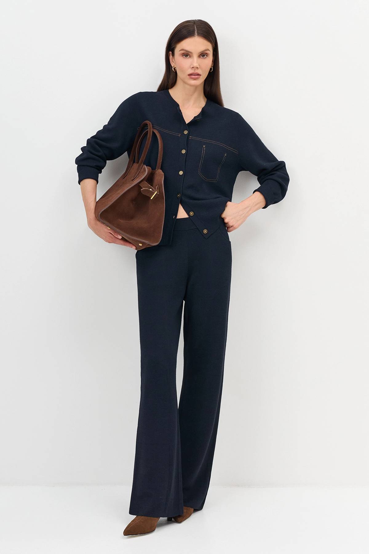 Вязаные широкие брюки с шерстью в составе. Прямой силуэт. Широкий пояс срезинкой. Боковые карманы в швах.