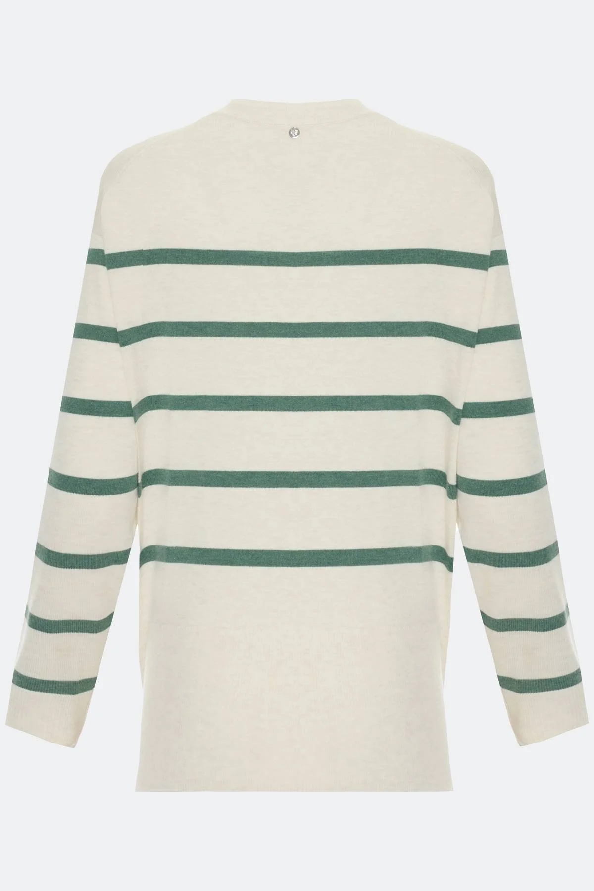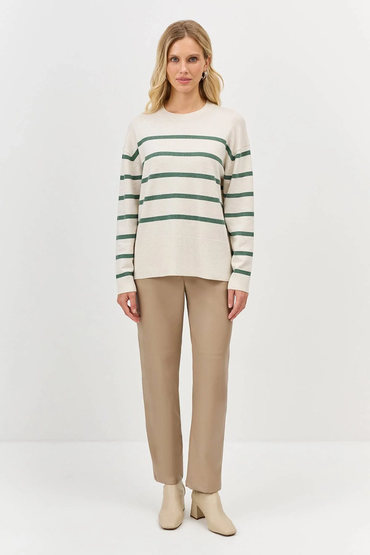Джемпер из смесовой вискозы в тонкую контрастную полоску. Свободный силуэт. Круглый вырез. Рукава со спущенной линией плеча. В составе шерсть.