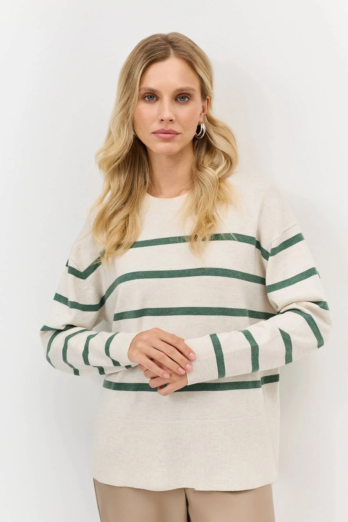 Джемпер из смесовой вискозы в тонкую контрастную полоску. Свободный силуэт. Круглый вырез. Рукава со спущенной линией плеча. В составе шерсть.
