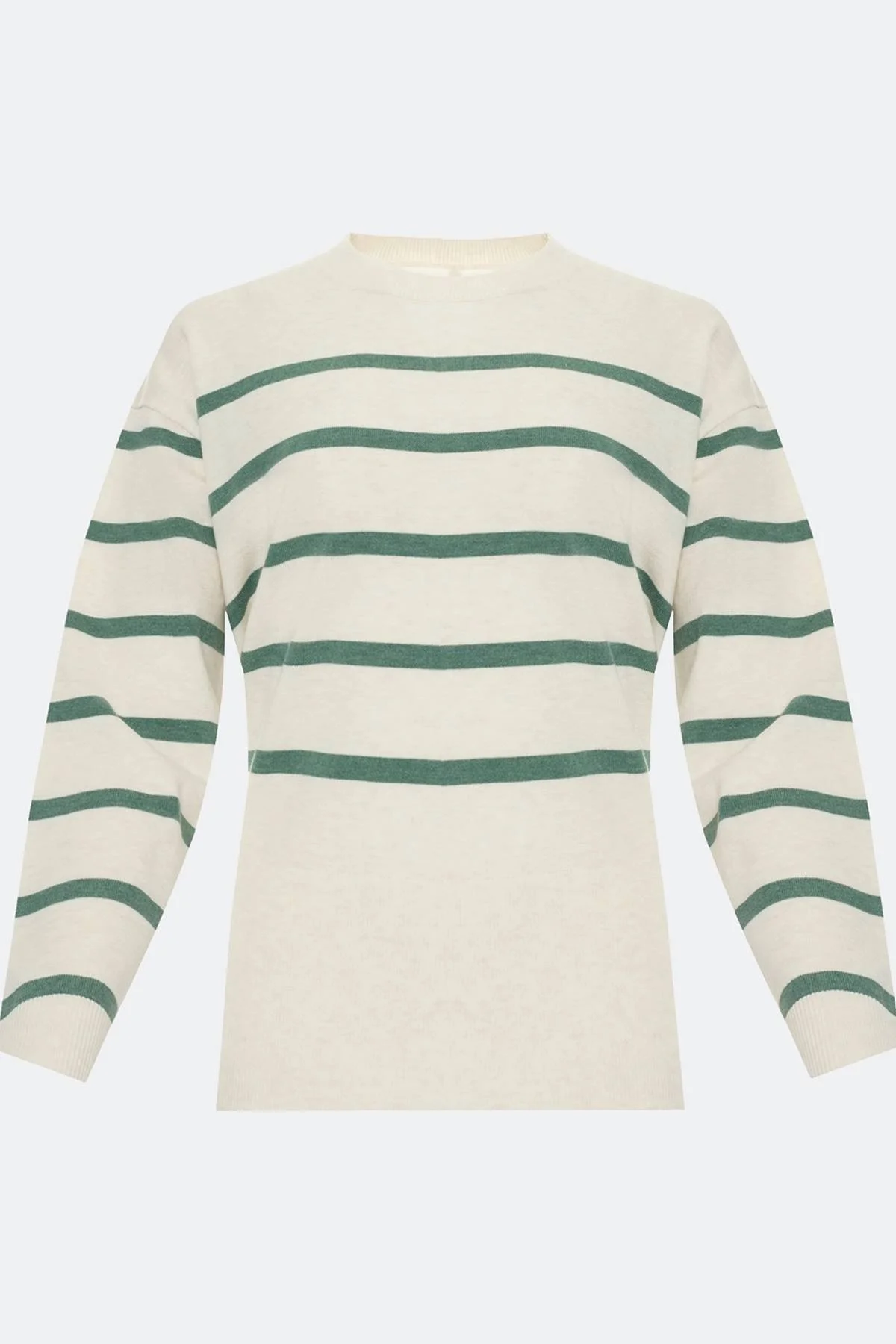 Джемпер из смесовой вискозы в тонкую контрастную полоску. Свободный силуэт. Круглый вырез. Рукава со спущенной линией плеча. В составе шерсть.