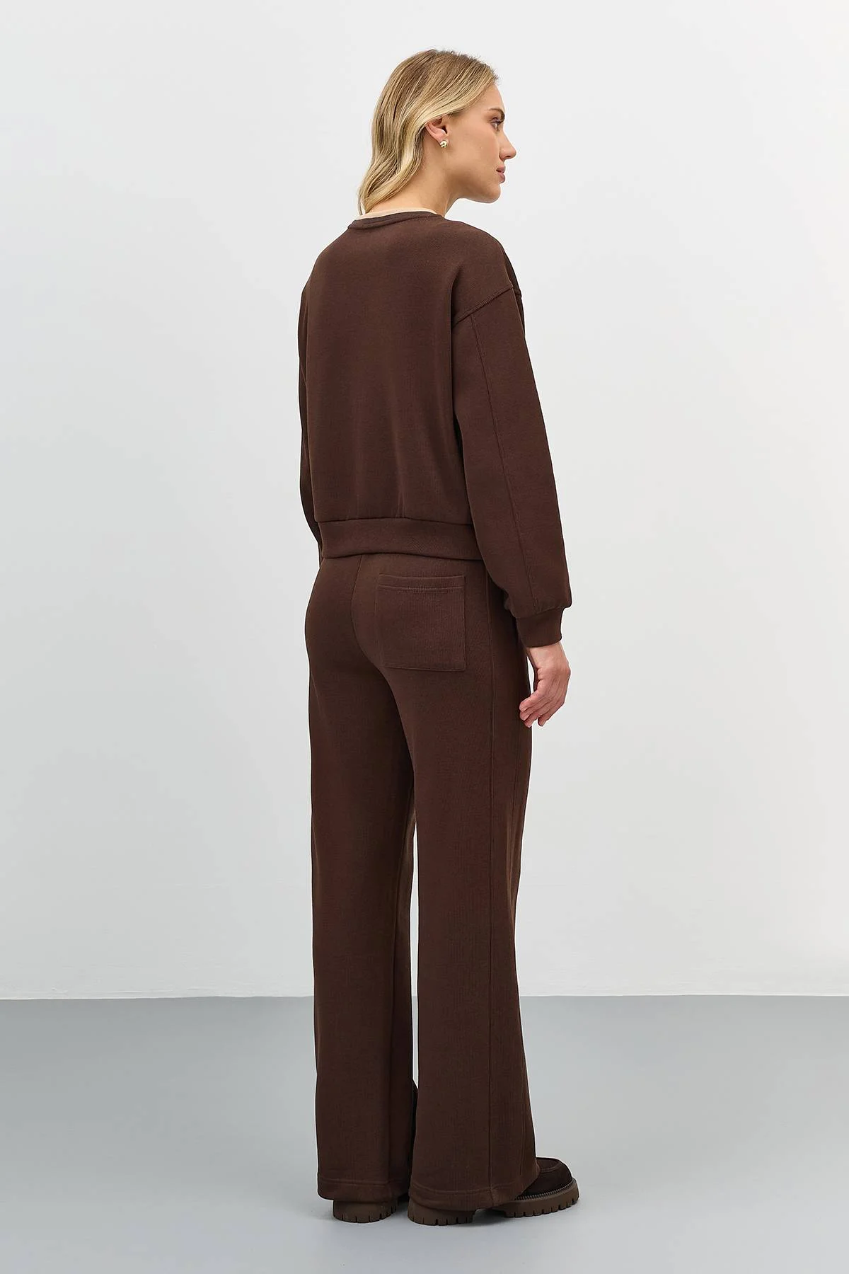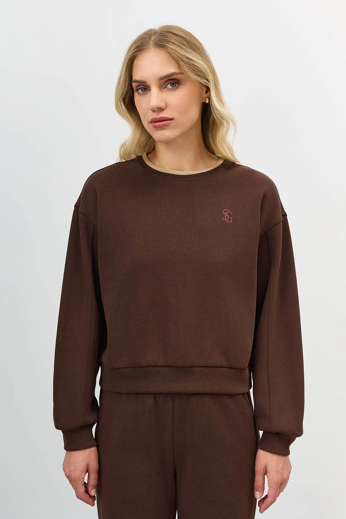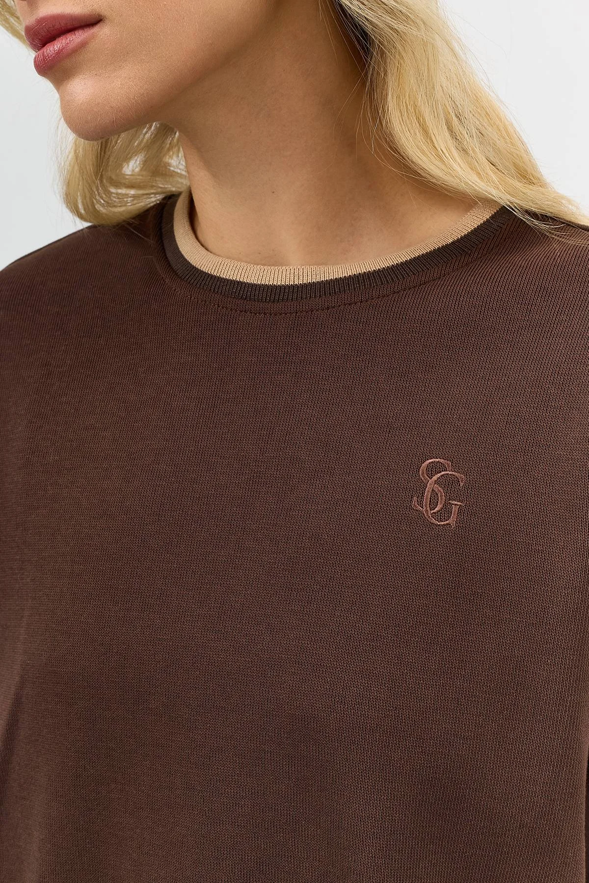 Укороченный свитшот из смесового трикотажного хлопка с деликатной вышивкой в цвет. Свободный силуэт. Круглый вырез дополнен рибом с контрастной отделкой. Спущенная линия плеч. Манжеты по низу рукавов и изделия. Комплект с арт. 60820.