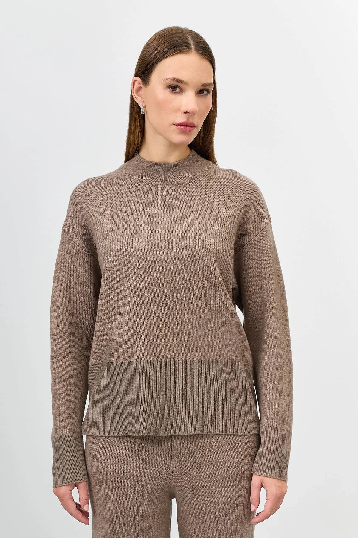 Свободный свитер с шерстью в составе. Свободный силуэт. Спущенная линия плеч. Воротник стойка. Широкие манжеты по низу рукавов и изделия. Комплект с арт. 60907.