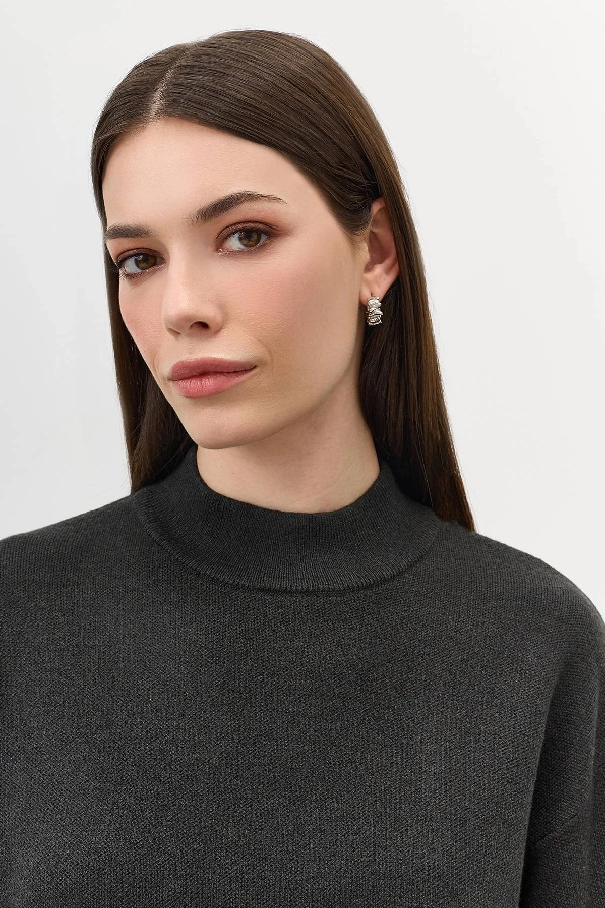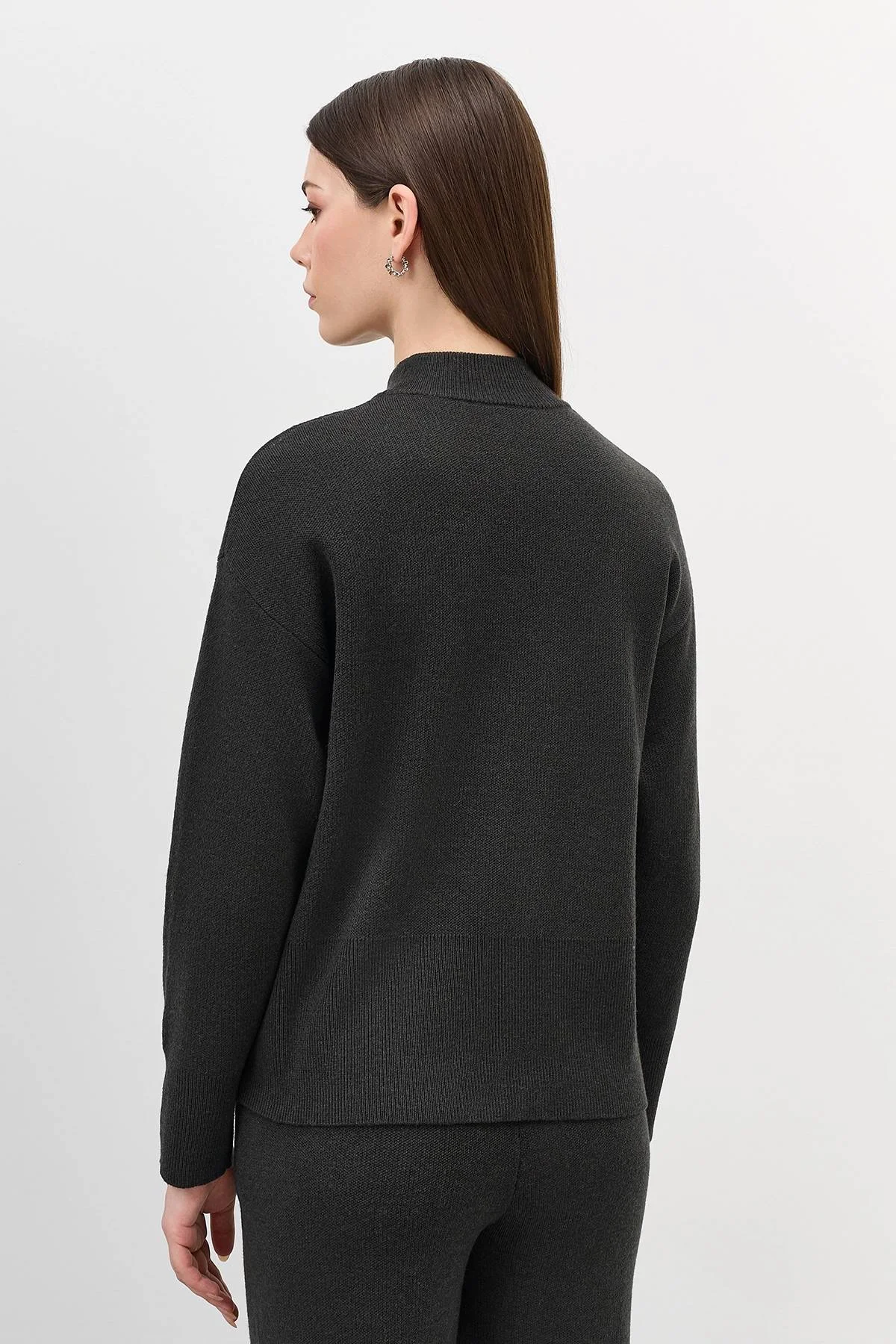 Свободный свитер с шерстью в составе. Свободный силуэт. Спущенная линия плеч. Воротник стойка. Широкие манжеты по низу рукавов и изделия. Комплект с арт. 60907.