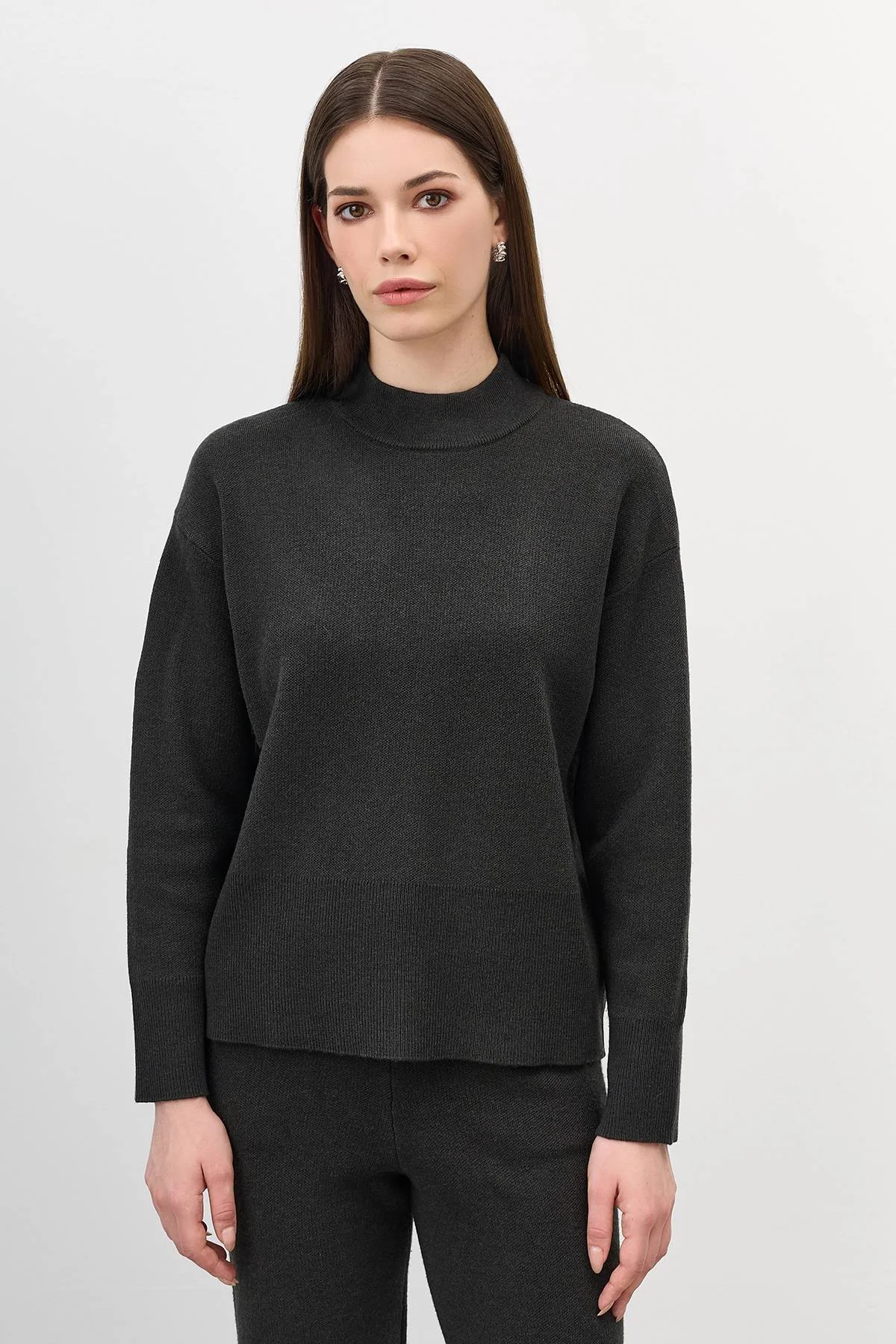 Свободный свитер с шерстью в составе. Свободный силуэт. Спущенная линия плеч. Воротник стойка. Широкие манжеты по низу рукавов и изделия. Комплект с арт. 60907.