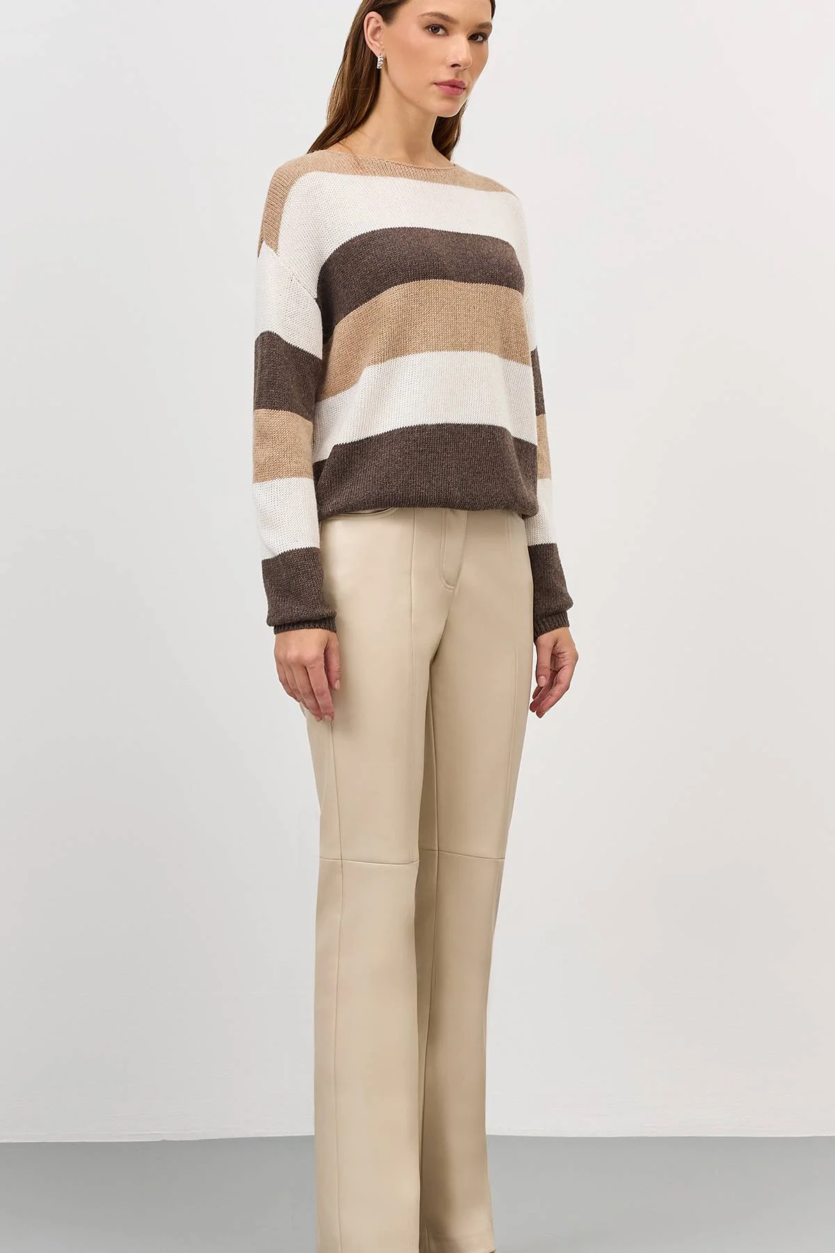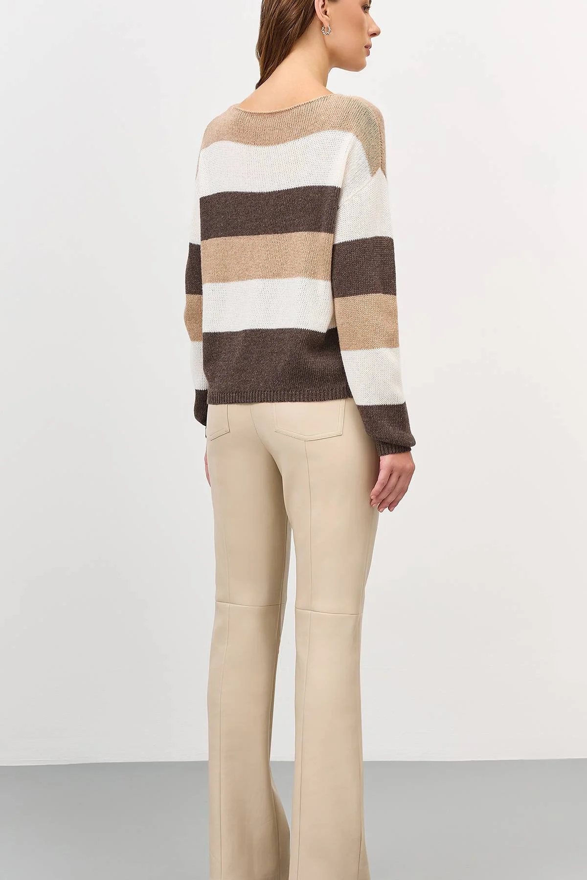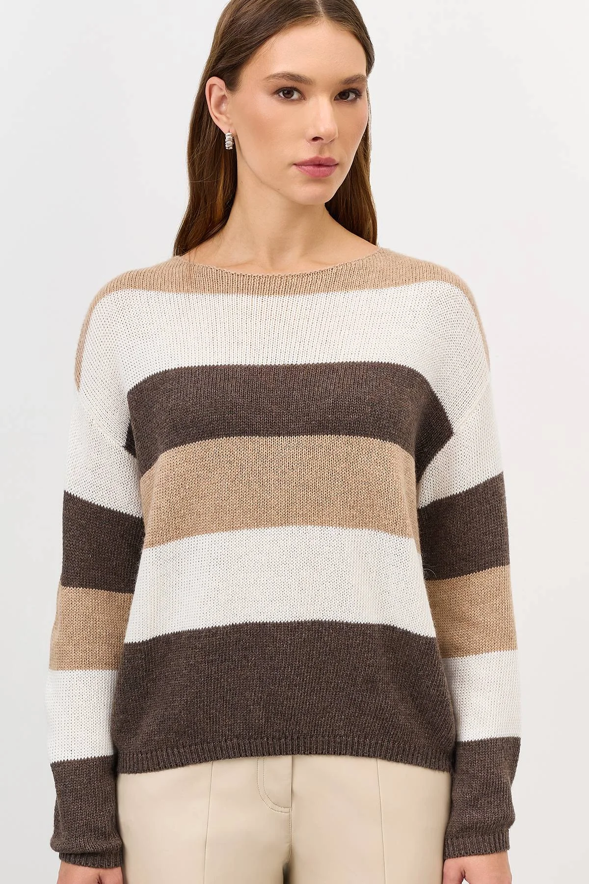 Тонкий джемпер в контрастную полоску. Прямой силуэт. Вырез лодочка. Спущенная линия плеч. В составе вискоза и ангора.