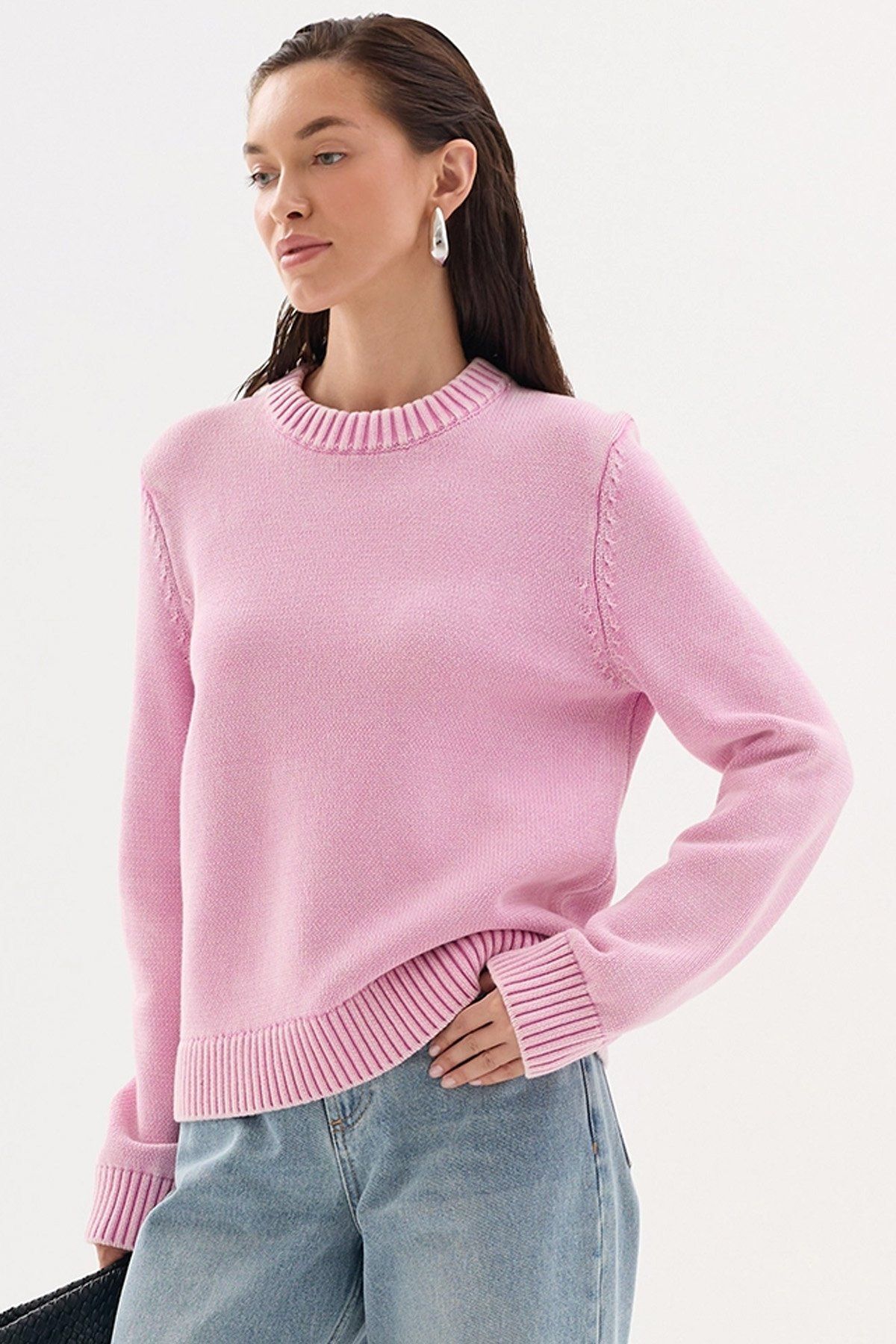 Трикотажный джемпер подчеркнет вашу индивидуальность и станет изысканным дополнением к любому образу. Круглый вырез горловины создает классический и элегантный силуэт, который идеально сочетается как с юбками, так и с брюками. Он добавляет образу женственности и шарма. Прямой крой обеспечивает комфорт и свободу движений, позволяя вам чувствовать себя уверенно в любой ситуации. Этот универсальный стиль подходит для разных случаев - от повседневной прогулки до более формальных встреч. Изготовлен из трикотажа с эффектом варки, джемпер выглядит оригинально и стильно. Это добавляет текстуры и визуального интереса, делая изделие особенно выразительным и привлекательным.