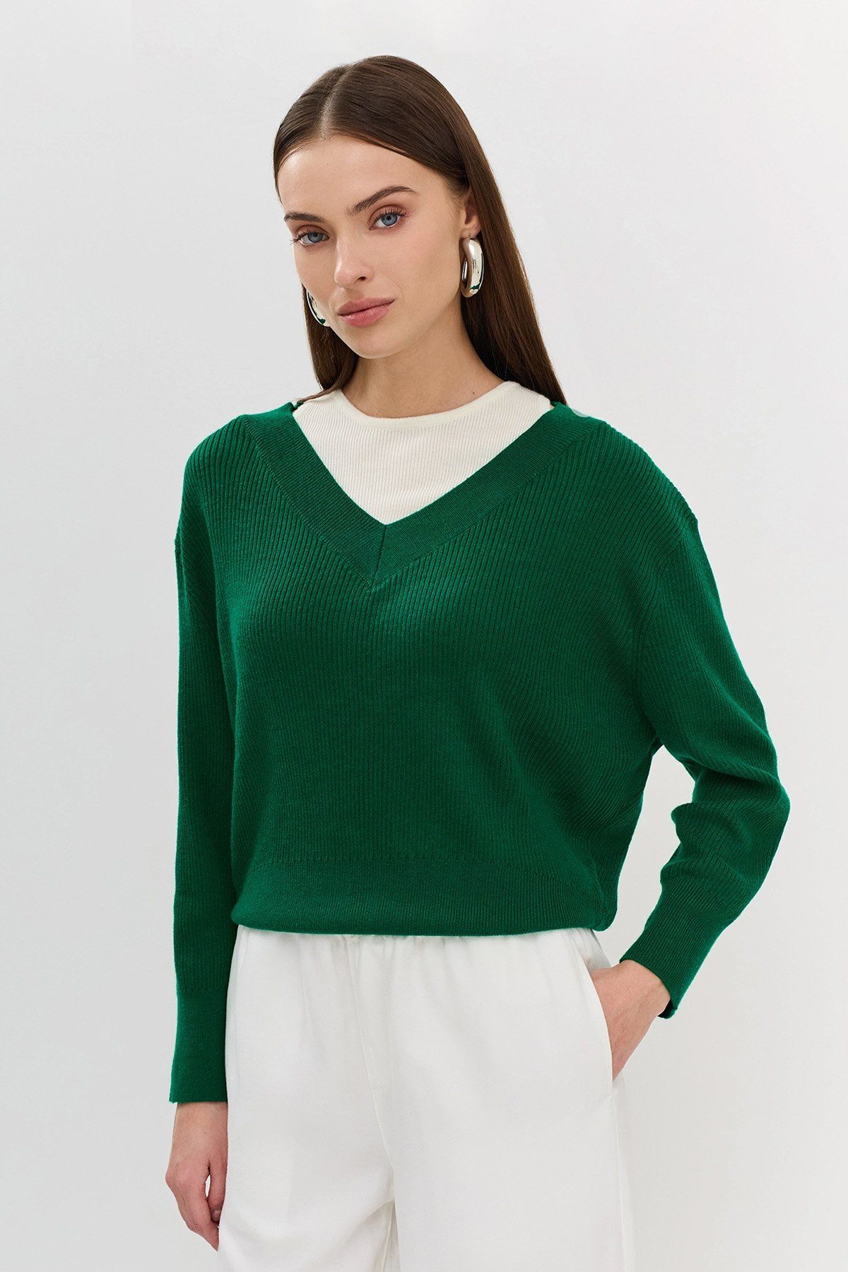 Трикотажный джемпер в зелёном цвете с иммитацией многослойности, 46р