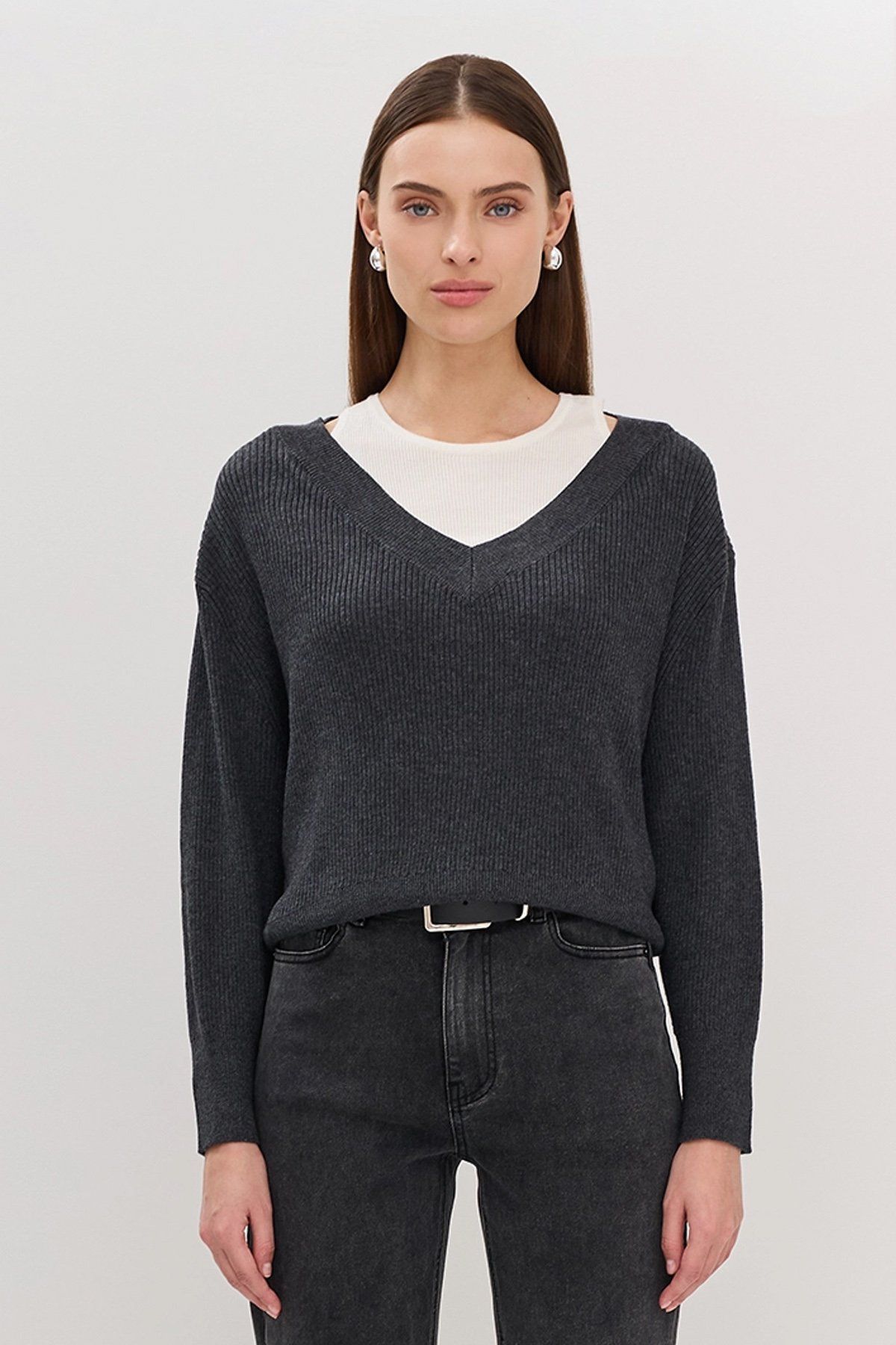 Трикотажный джемпер в графитовом цвете с имитацией многослойности, 50р