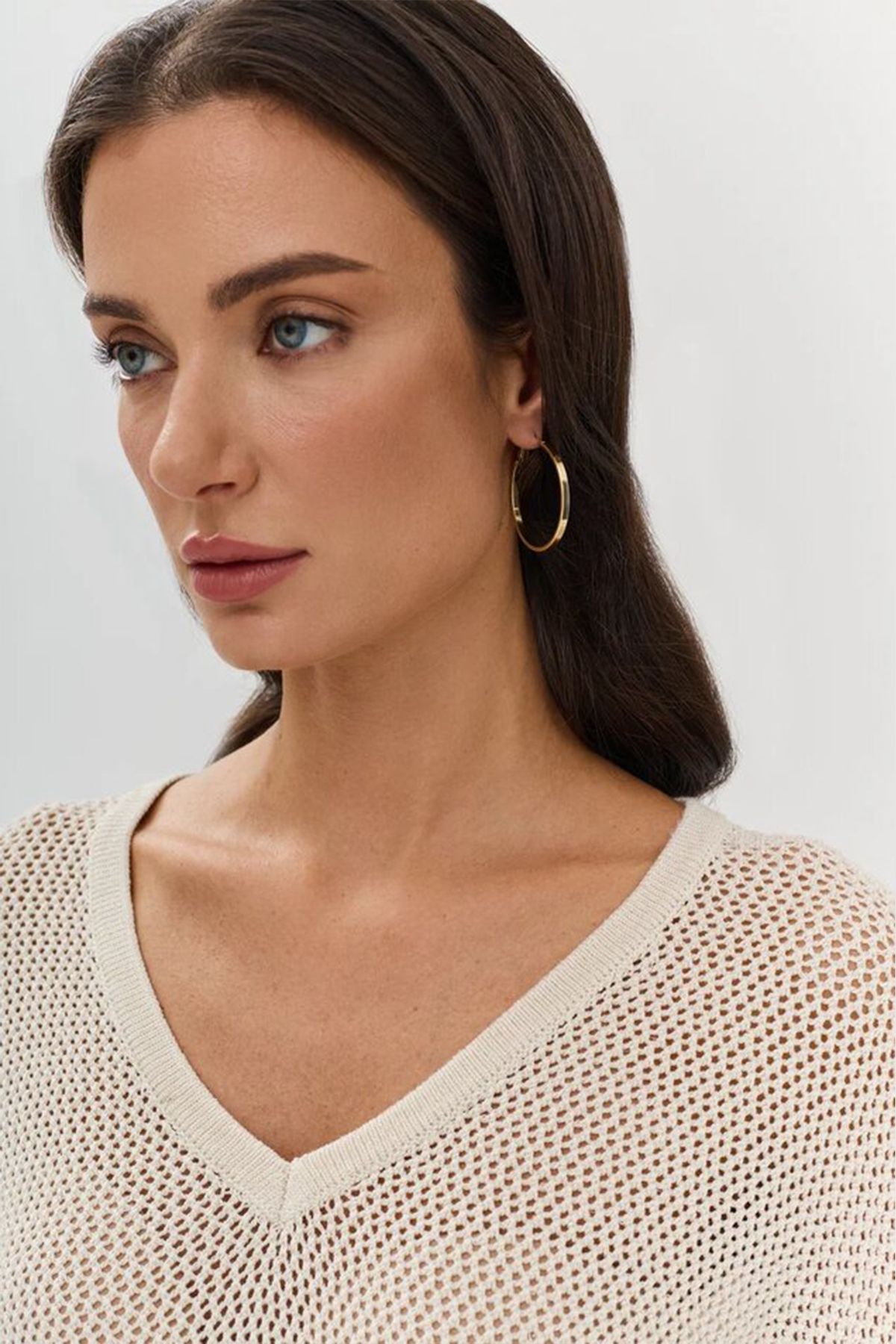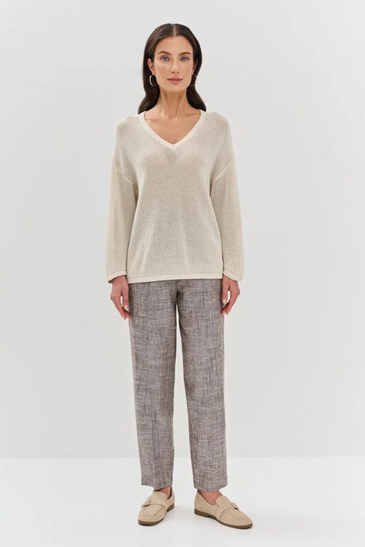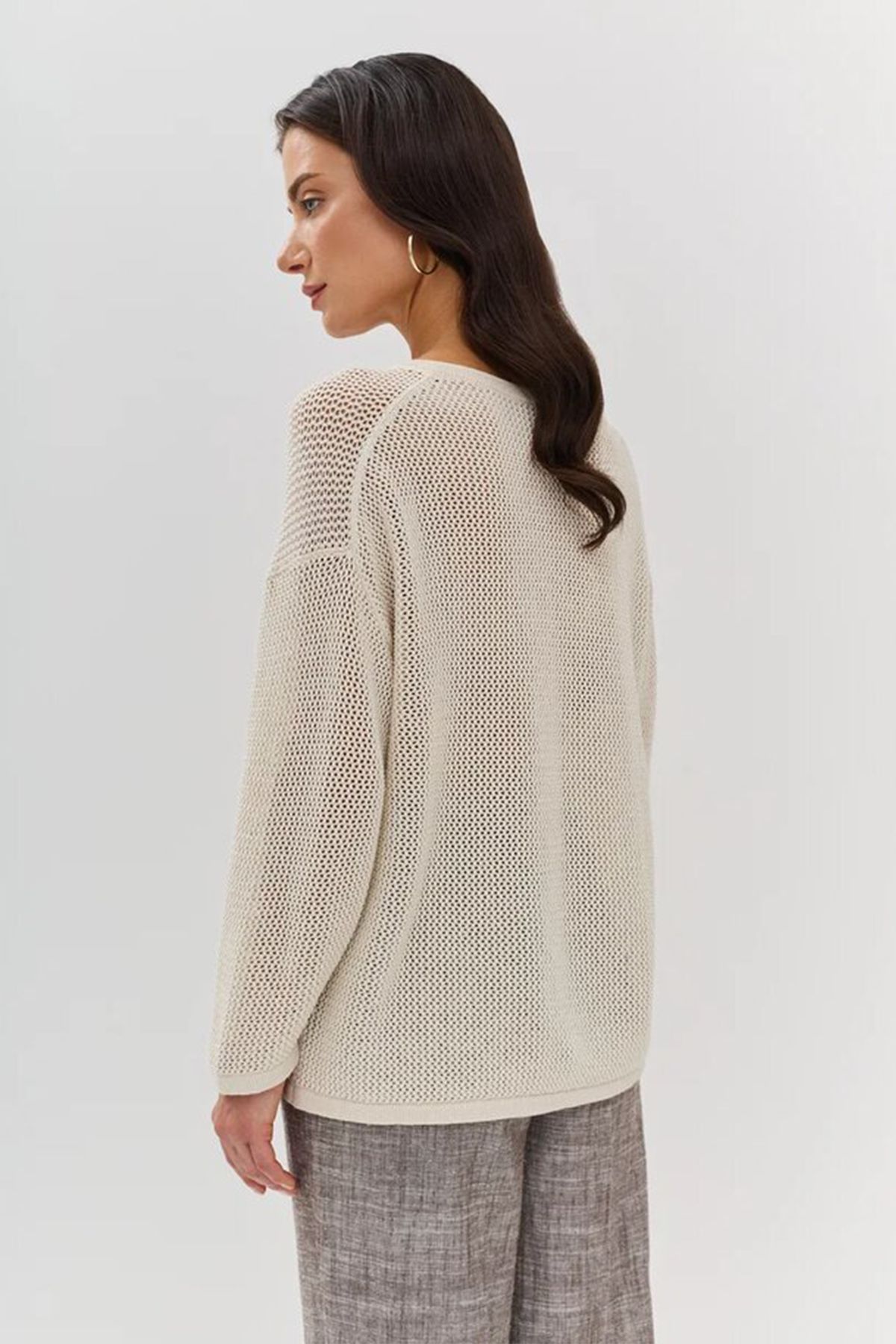 Трикотажный джемпер в сетку - настоящая находка для любителей стильных и актуальных вещей. Его V-образный вырез горловины добавляет изящности и визуально удлиняет шею, придавая образу женственности и элегантности. Длинные рукава делают этот джемпер идеальным для различных сезонов, обеспечивая комфорт в прохладные дни. Особый акцент на фактуре сетки создаёт легкость и воздушность, что добавляет интересный элемент в ваш гардероб. Этот джемпер прекрасно сочетает стиль и функциональность: его можно носить как самостоятельно, так и в слоистой компоновке с майками или топами. Он хорошо будет смотреться как с джинсами, так и с юбками, что позволяет создать множество различных образов - от повседневного до более изысканного.