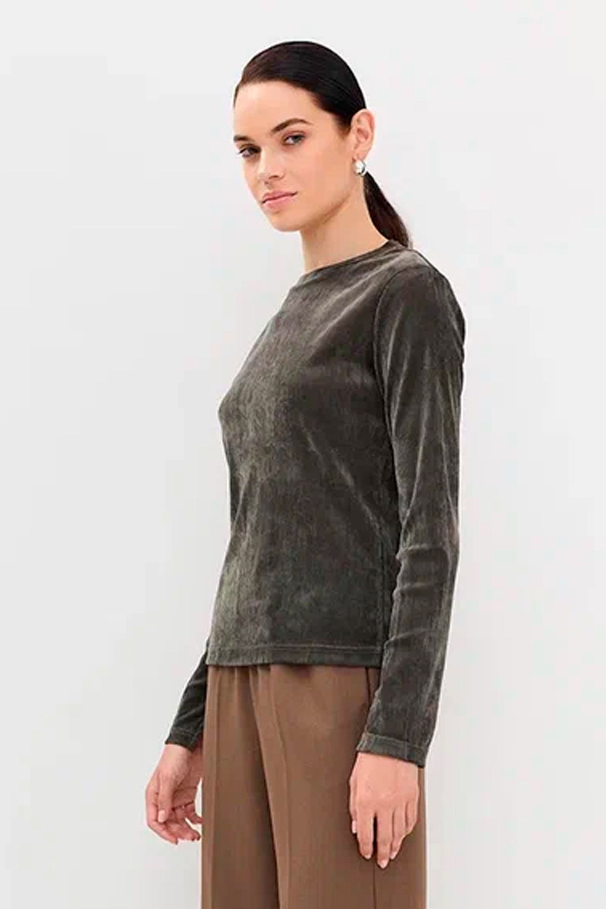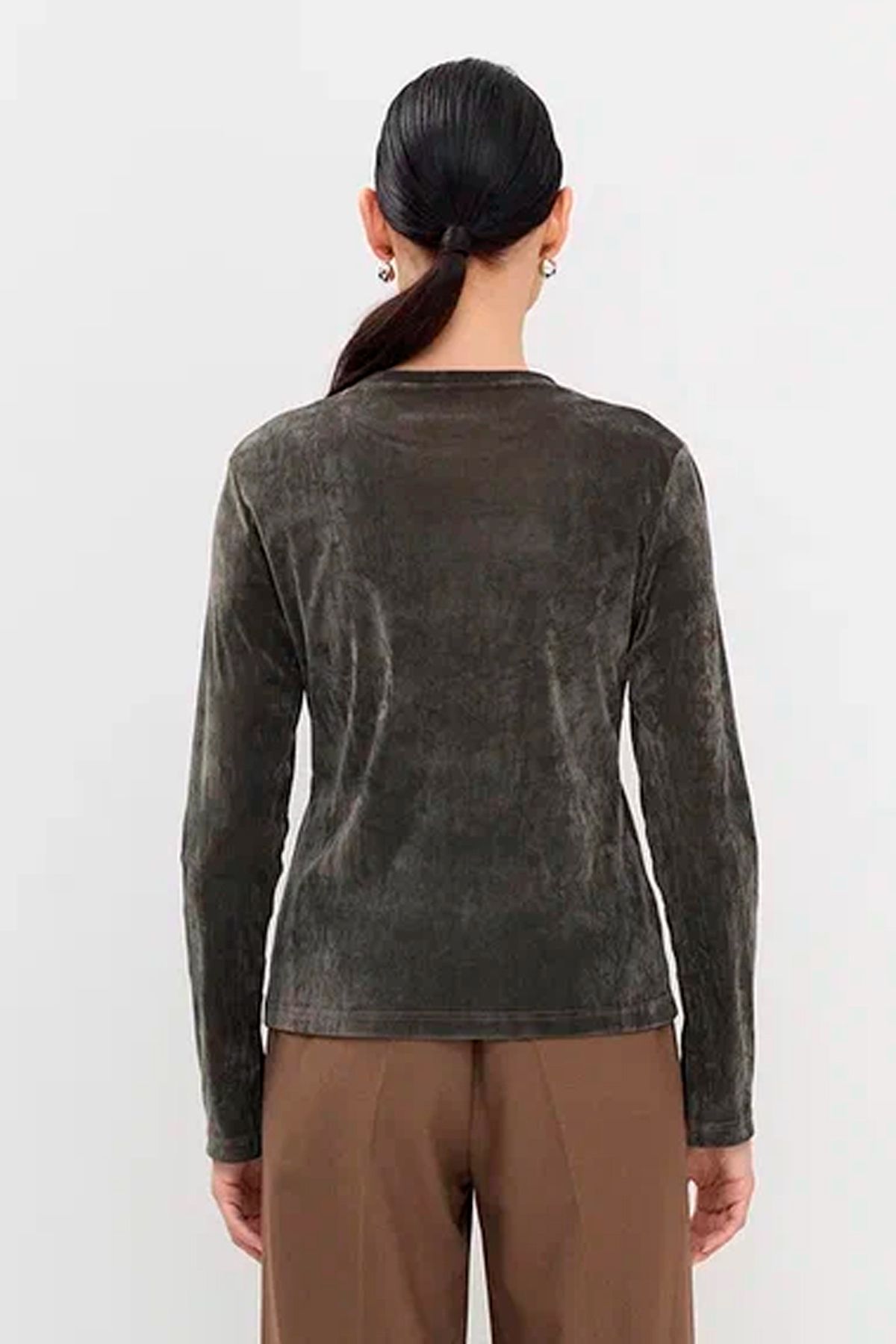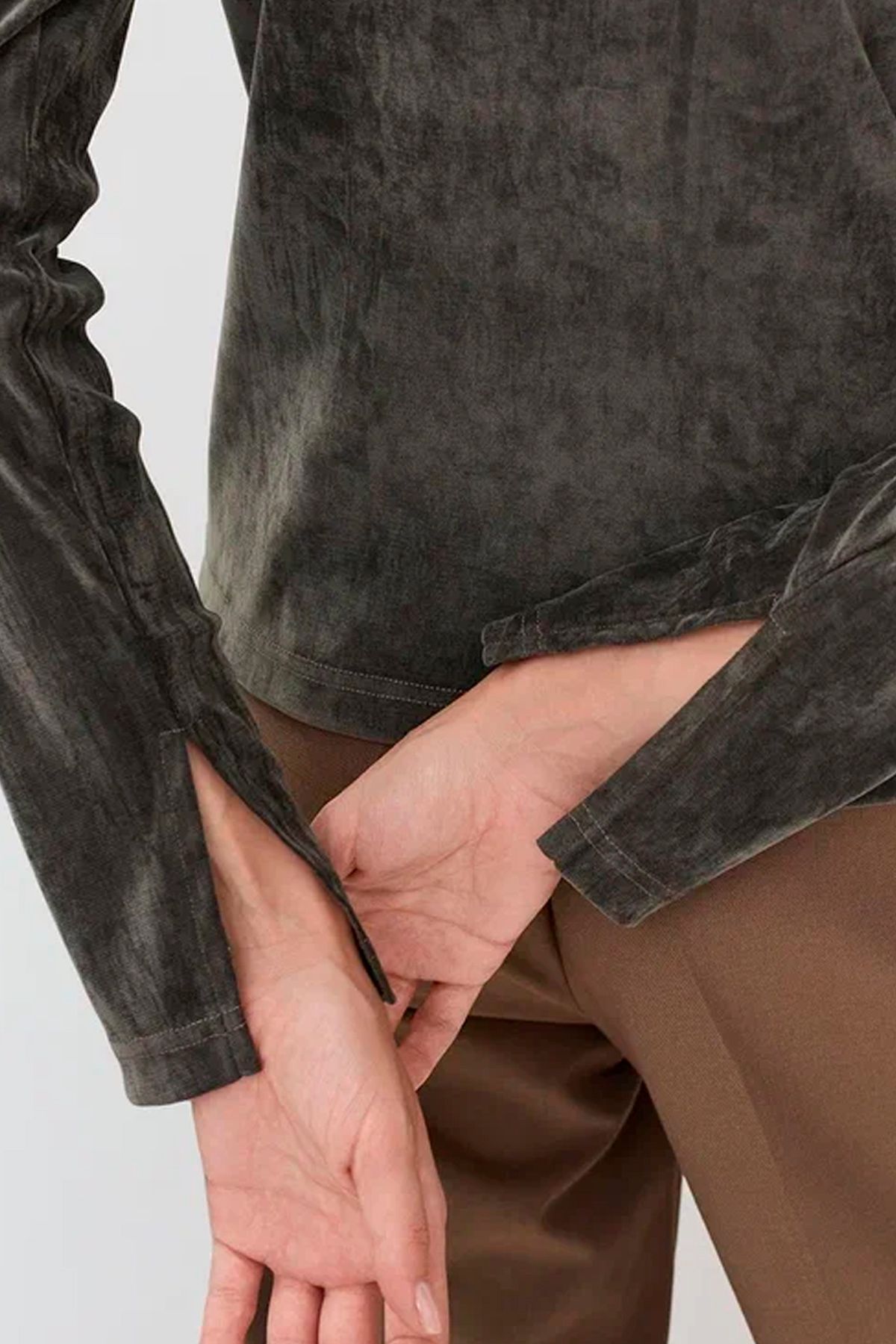 Велюровый джемпер-лонгслив с разрезами на рукавах. Велюр медленно, но верно возвращается в качестве тренда. Приталенный крой аккуратно подчёркивает талию. Разрезы на рукавах добавляют внимания кистям рук. Круглый вырез горловины комфортен во время ношения. Лонгслив отлично подойдет для сочетания с различными вариантами низа (брюки, джинсы).