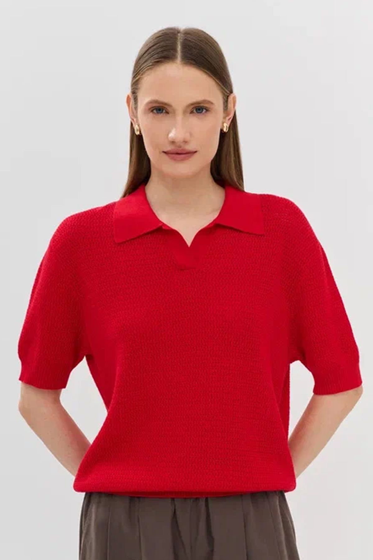 Вязаное фактурное поло из вискозы и хлопка в красном цвете, 44р