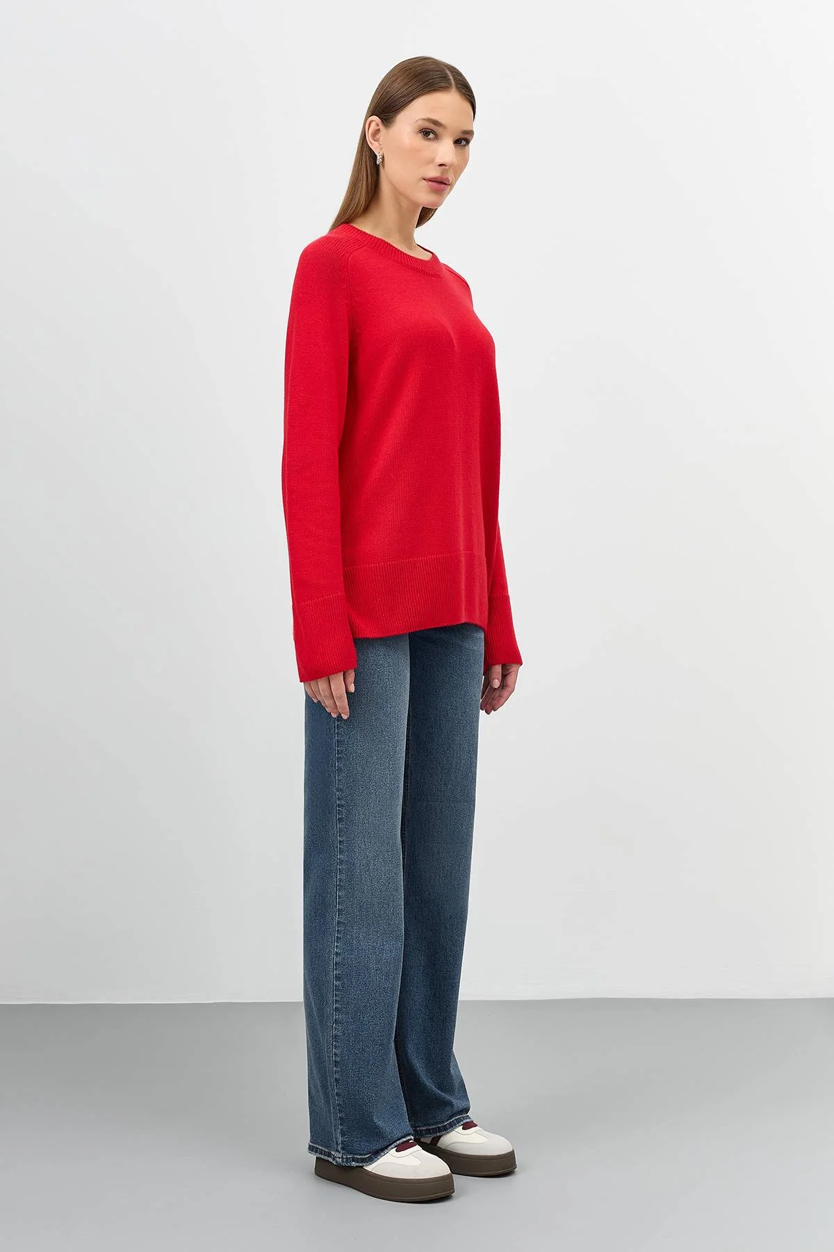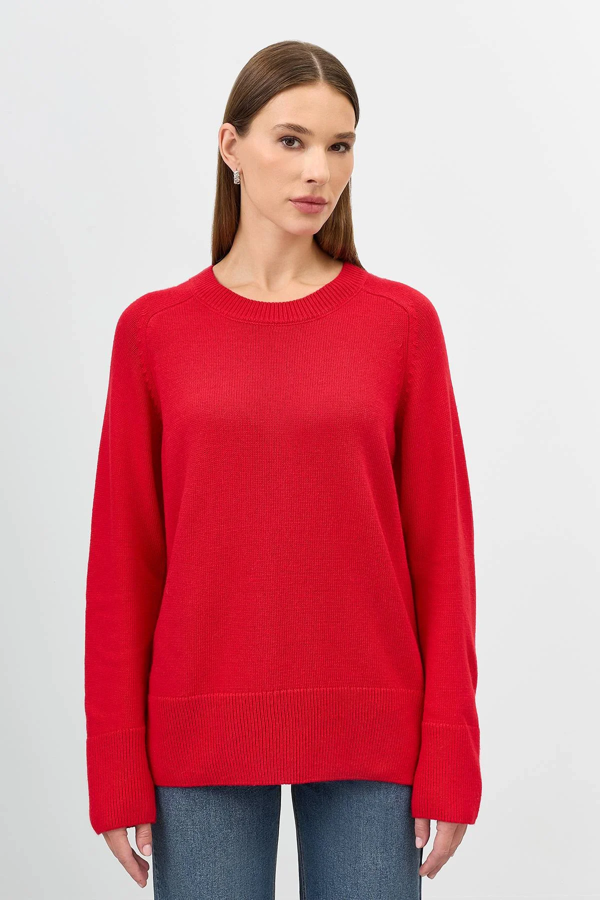 Яркий джемпер с ангорой в составе. Прямой силуэт. Круглый вырез. Длинные рукава реглан. Боковые разрезы в швах. Широкие манжеты по низу рукавов и изделия.