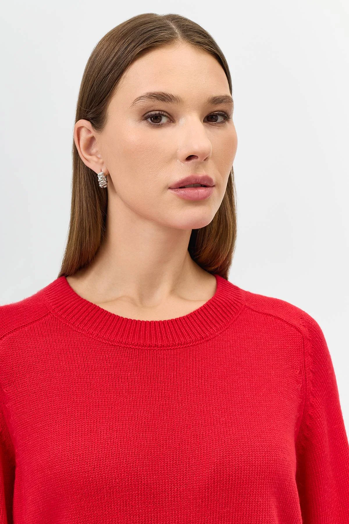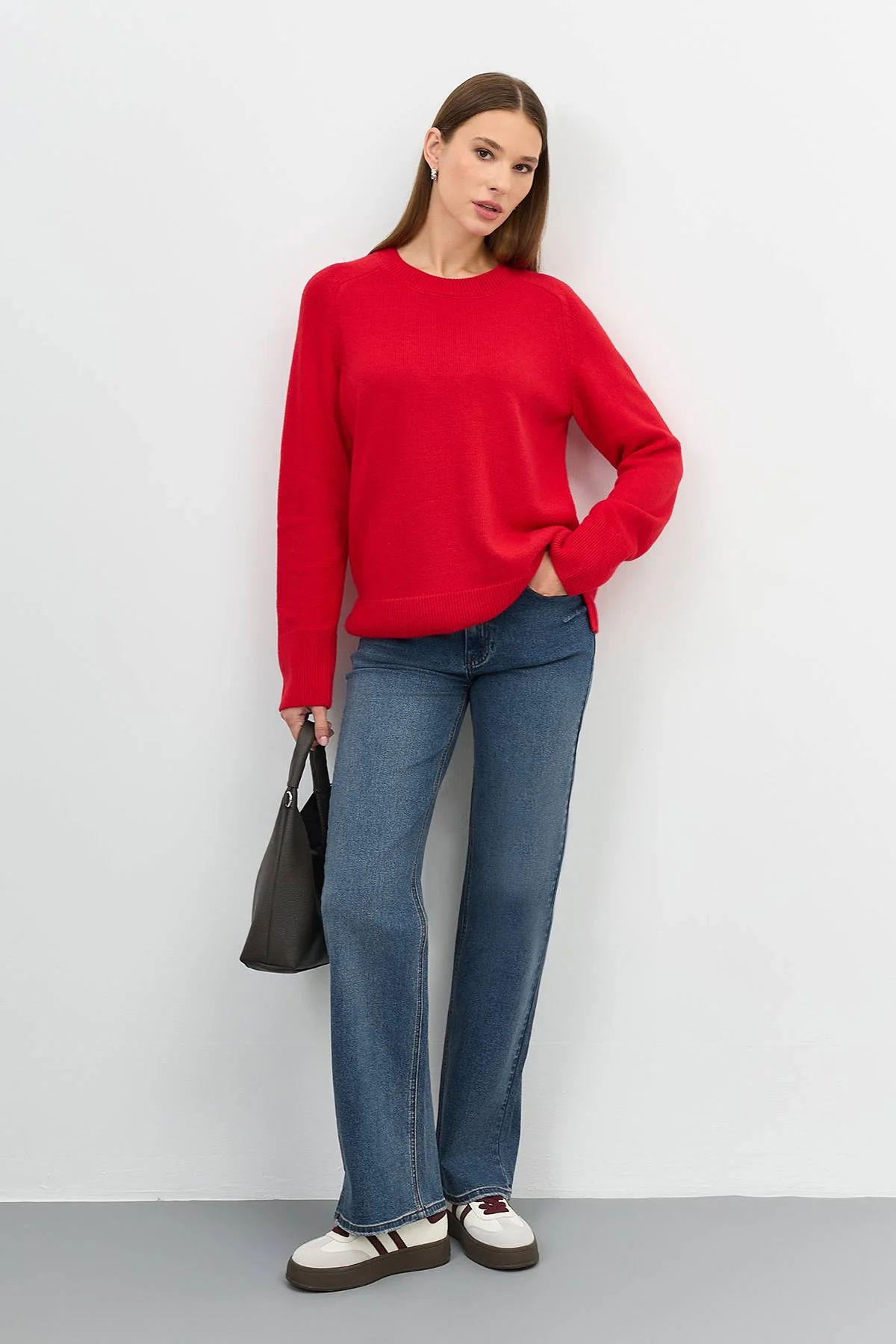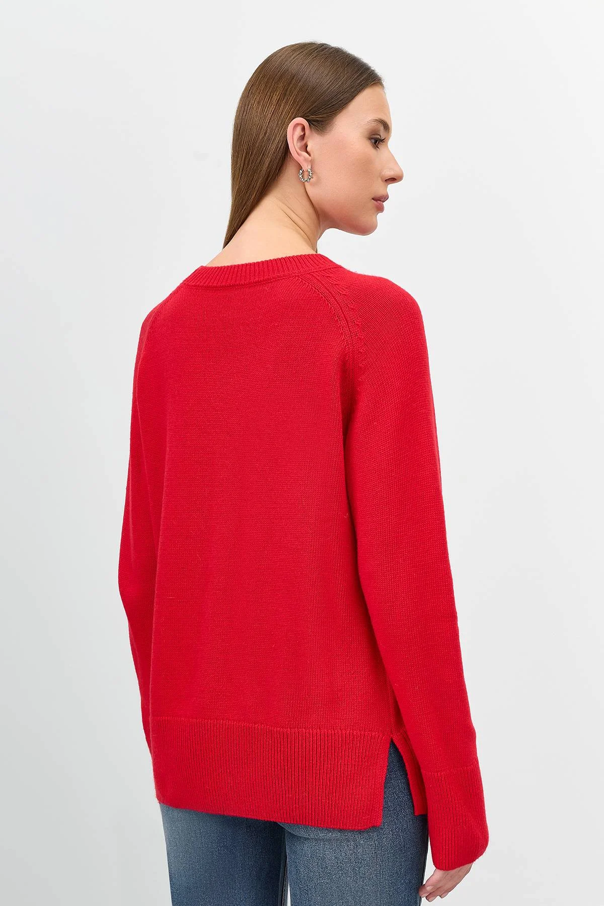 Яркий джемпер с ангорой в составе. Прямой силуэт. Круглый вырез. Длинные рукава реглан. Боковые разрезы в швах. Широкие манжеты по низу рукавов и изделия.