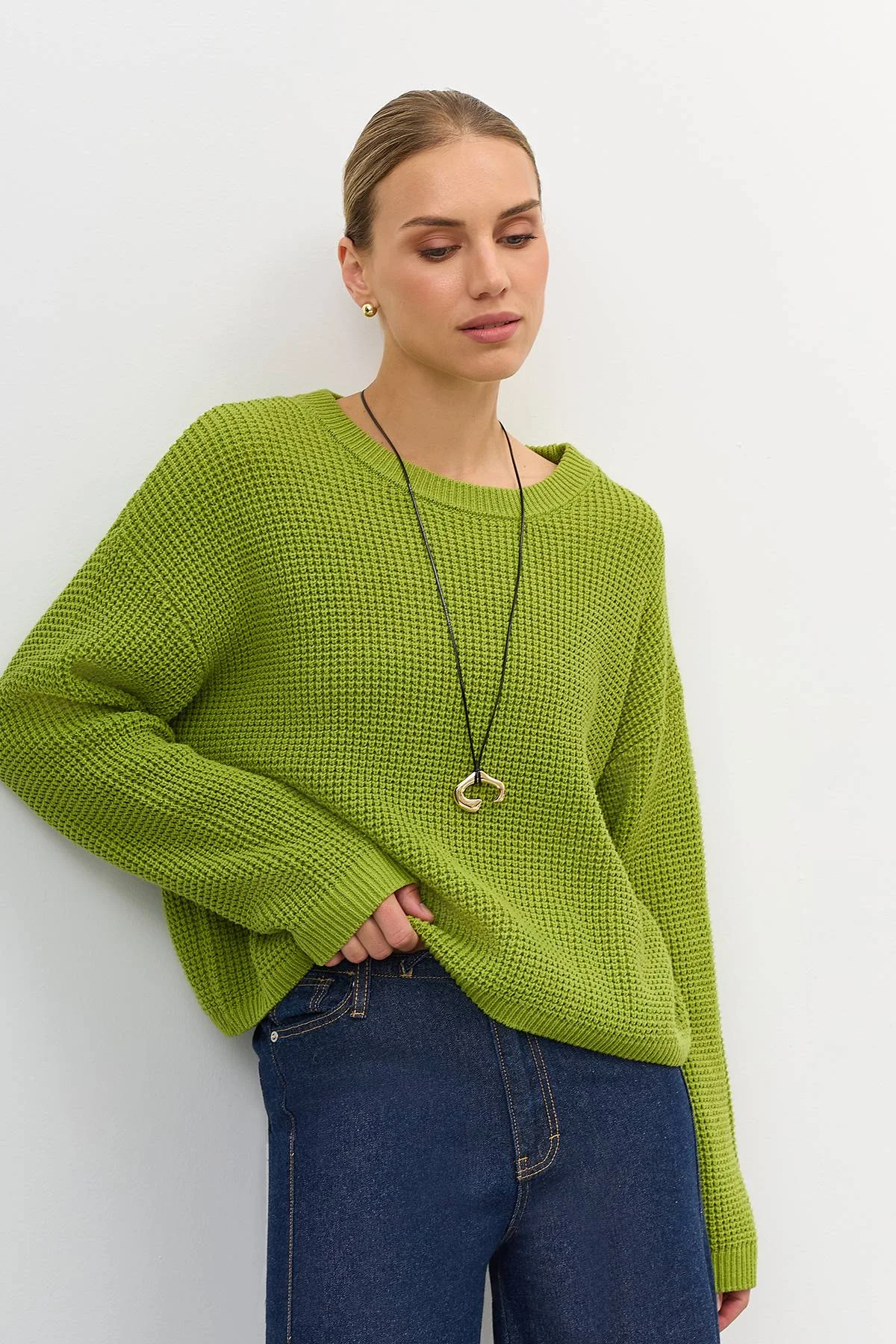 Яркий объемный свитер из хлопка. Свободный силуэт. Спущенная линия плеч. Круглый вырез. Фактурная вязка. Риб по горловине, низу рукавов и изделия.
