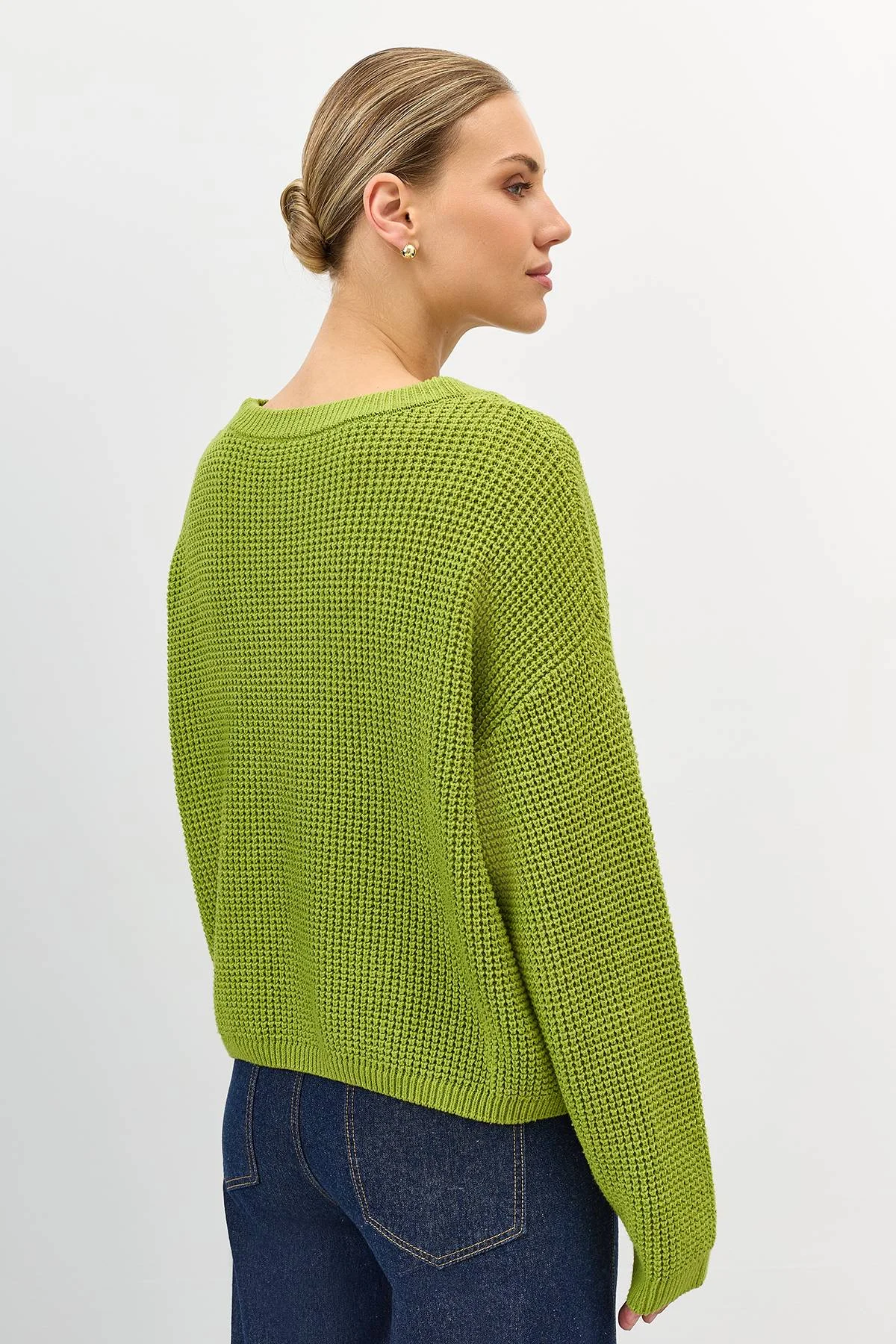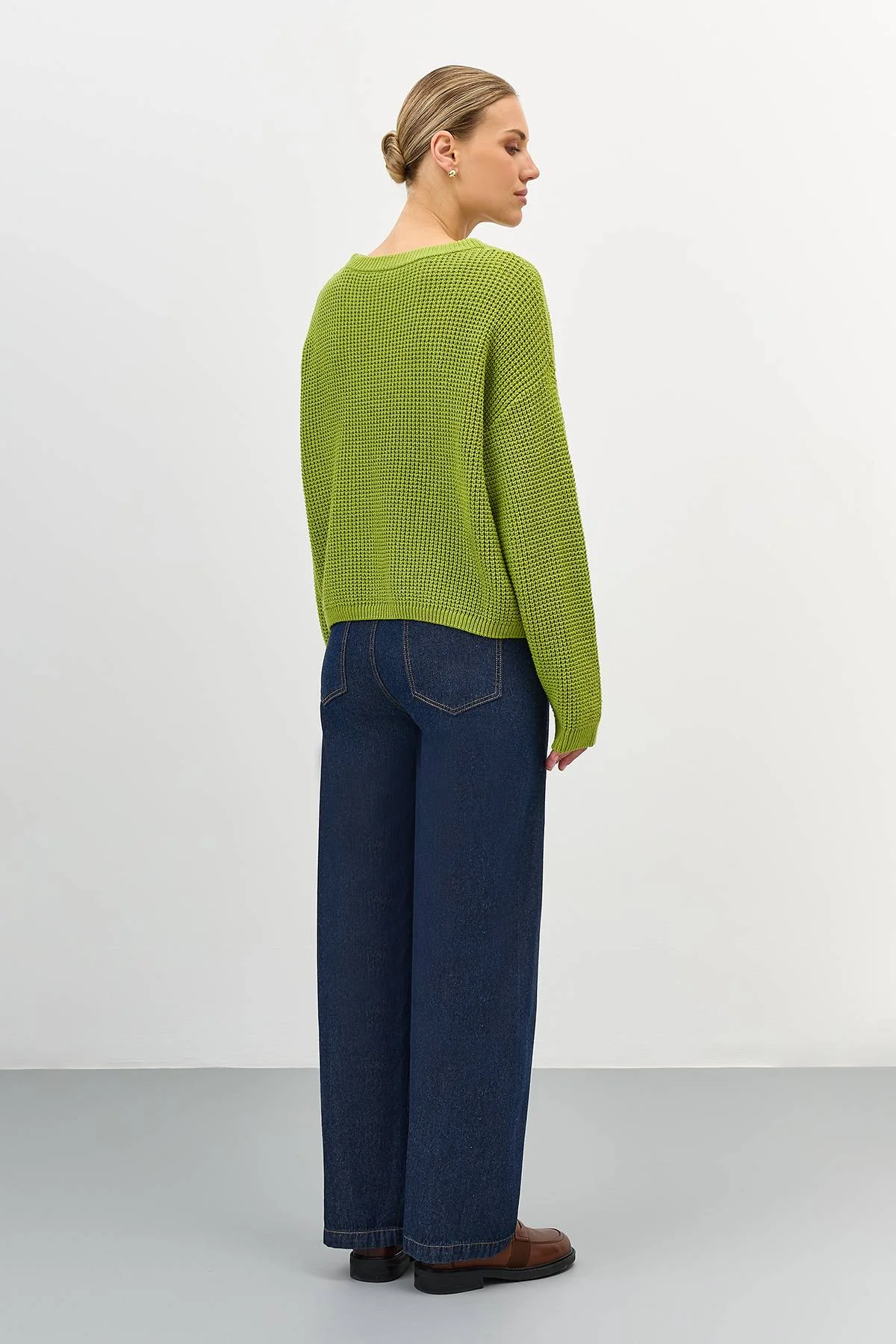 Яркий объемный свитер из хлопка. Свободный силуэт. Спущенная линия плеч. Круглый вырез. Фактурная вязка. Риб по горловине, низу рукавов и изделия.