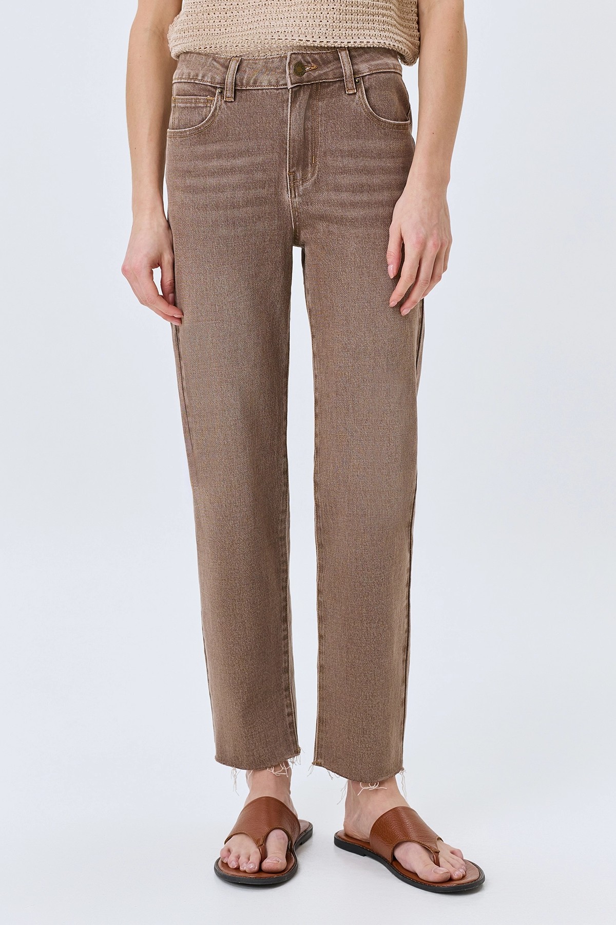 Бежевые джинсы с деликатной варкой. Прямой силуэт заужен к низу. Застежка на молнию и металлическую пуговицу. Пять карманов. Дополнены необработанным краем по низу и кантом из эко кожи по задним карманам. В составе спандекс.