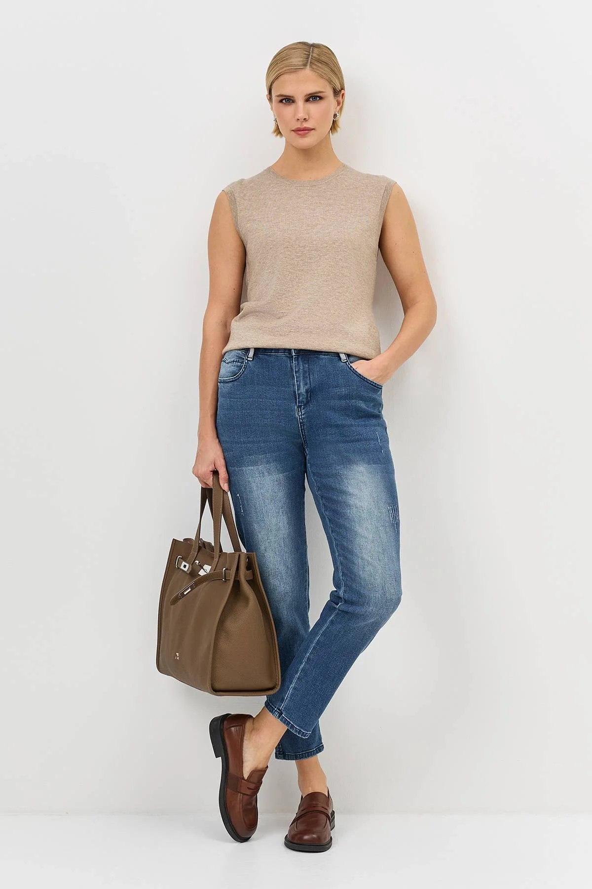 Универсальный прямой крой с мягким сужением книзу создает аккуратный повседневный силуэт. Деликатная варка и декоративная тесьма на шлёвках добавляют модели стильные детали. Эластичный материал обеспечивает комфорт и сохраняет форму в течение дня.