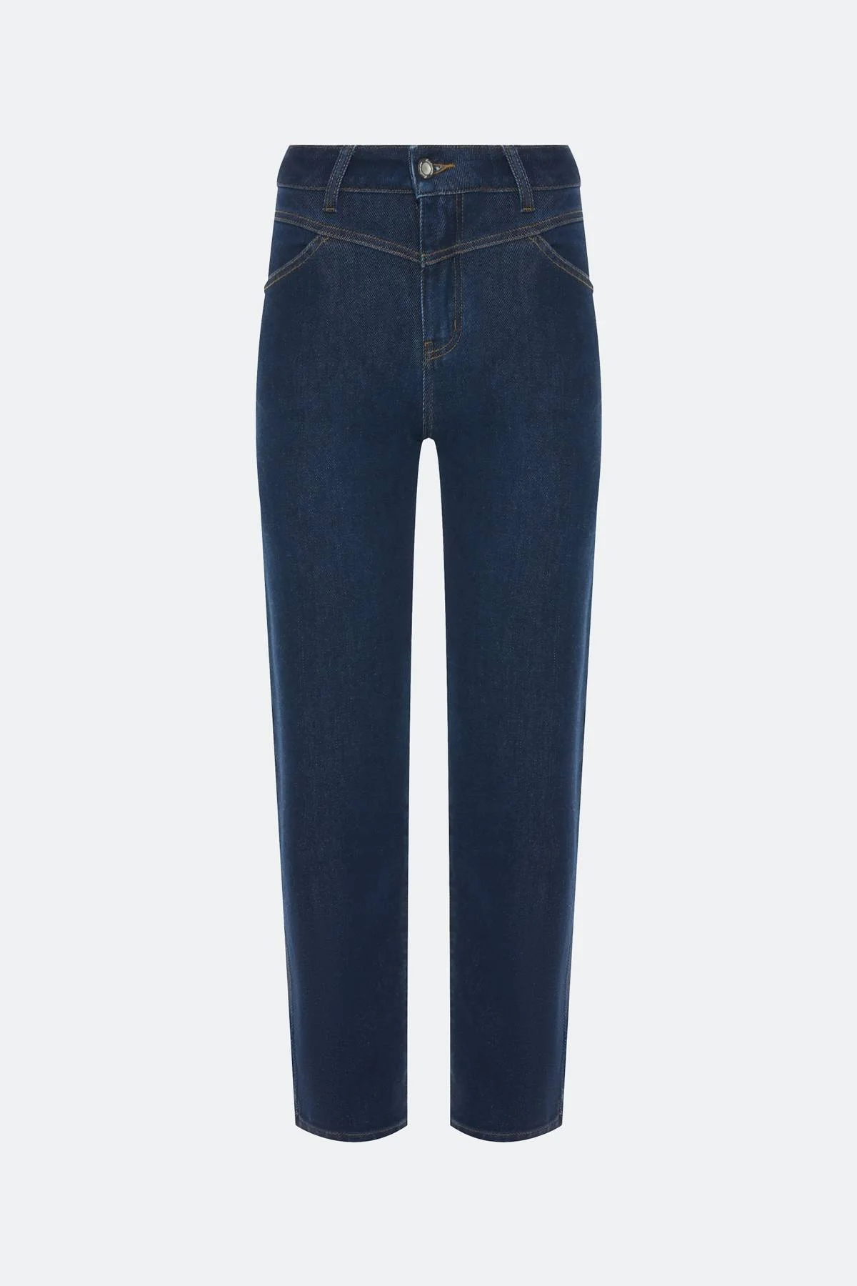 Джинсы с акцентной отрезной кокеткой из классического денима. Прямой силуэт немного заужен к низу. Застежка на молнию и металлическую пуговицу. Четыре кармана. В составе спандекс.