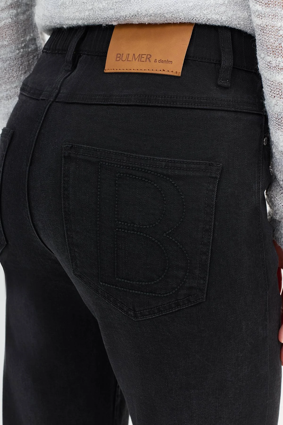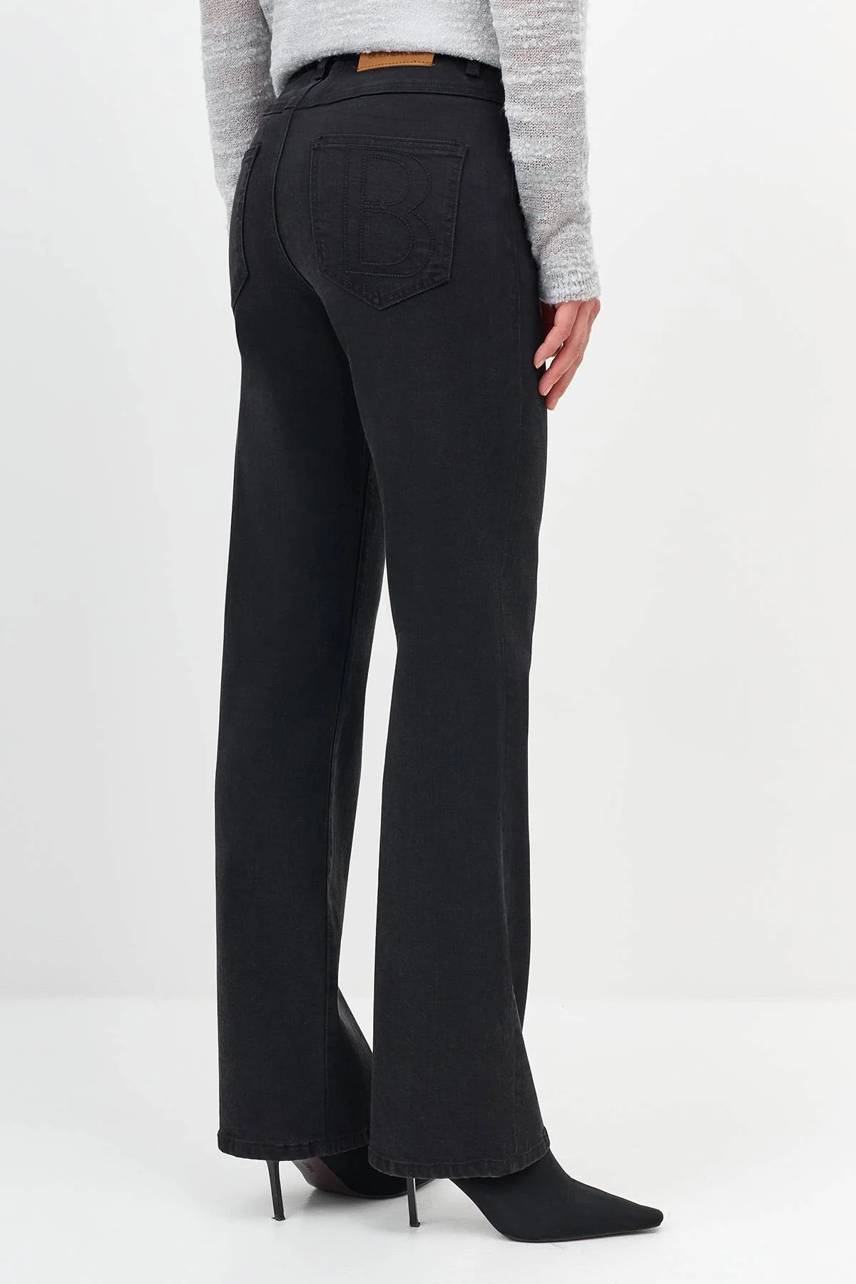 Классический прямой крой в глубоком черном оттенке создает универсальную основу для любого образа. Мягкий деним с эластаном обеспечивает комфорт и свободу движений. Аккуратная вышивка в тон на заднем кармане делает модель более детализированной.
