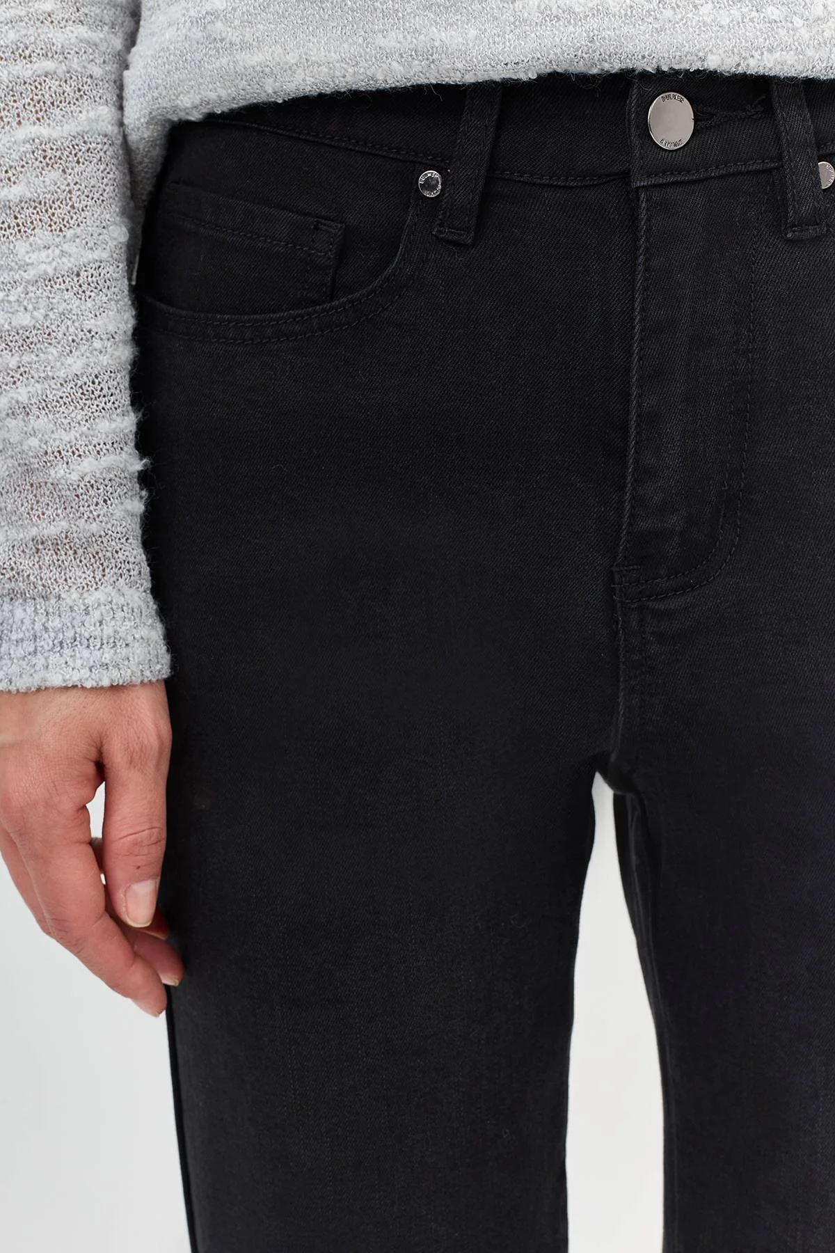 Классический прямой крой в глубоком черном оттенке создает универсальную основу для любого образа. Мягкий деним с эластаном обеспечивает комфорт и свободу движений. Аккуратная вышивка в тон на заднем кармане делает модель более детализированной.
