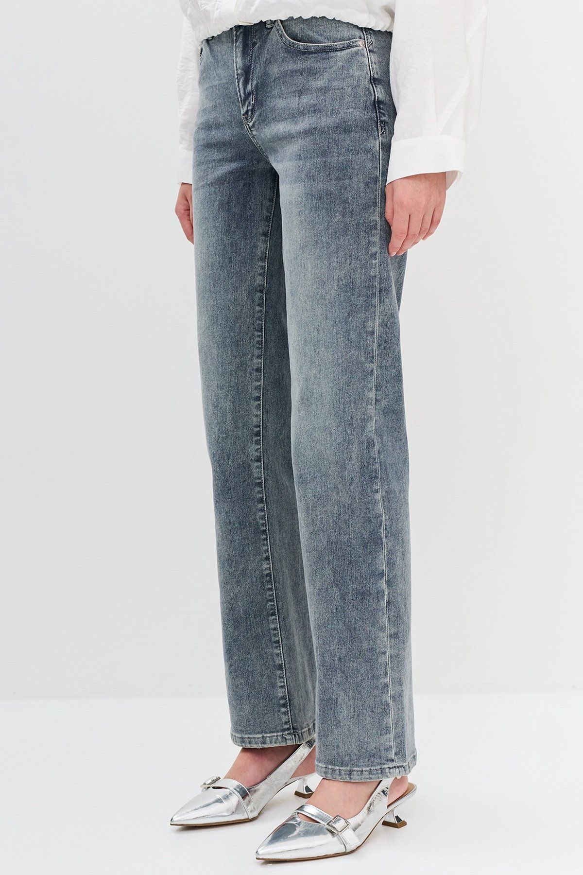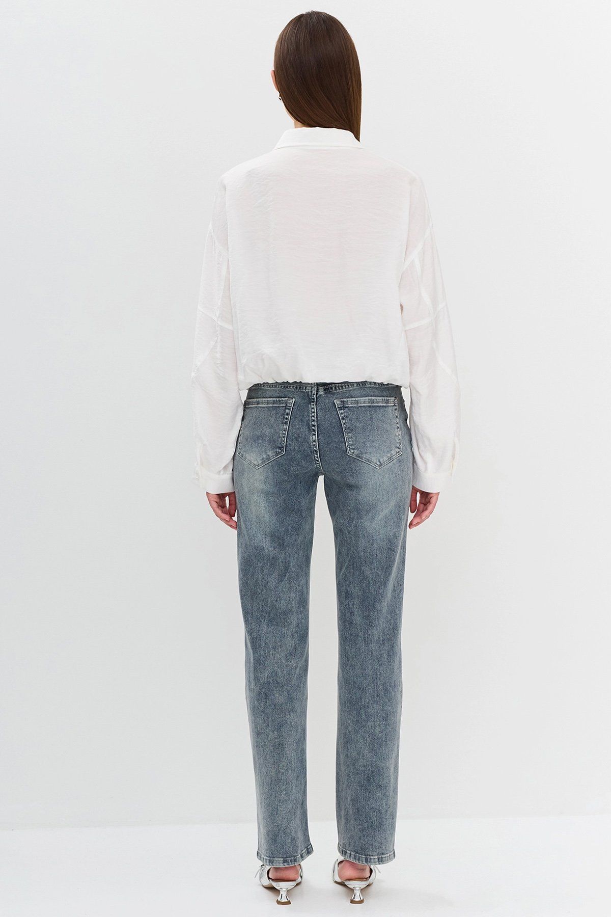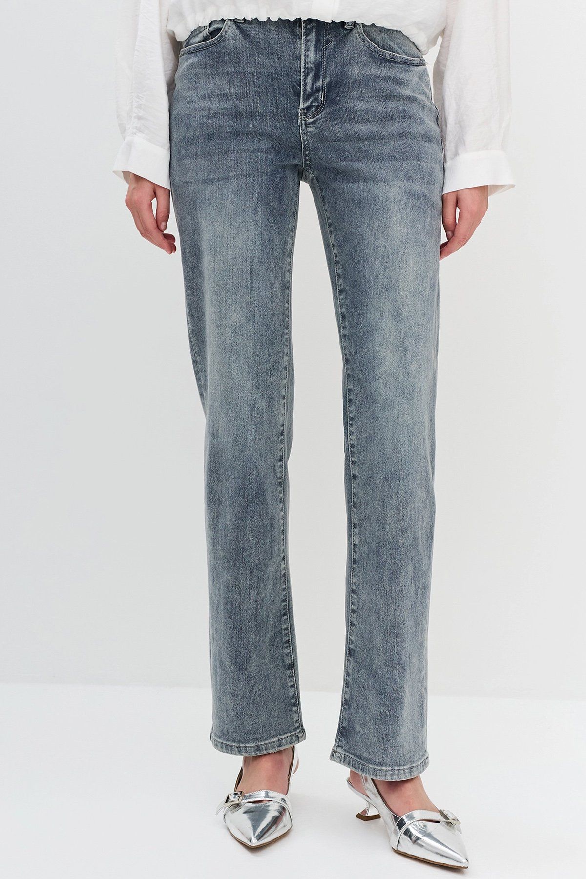 Прямые джинсы из светлого денима хорошо подойдут для повседневных образов. Прямой крой штанин визуально удлиняет ноги. Функциональные прорезные и накладные карманы. Шлёвки позволяют по желанию дополнить модель поясом. Застёжка на молнию и металлическую пуговицу обеспечивает удобство ношения. Джинсы можно сочетать с любым видом верха (джемперы, топы, футболки, блузки).
