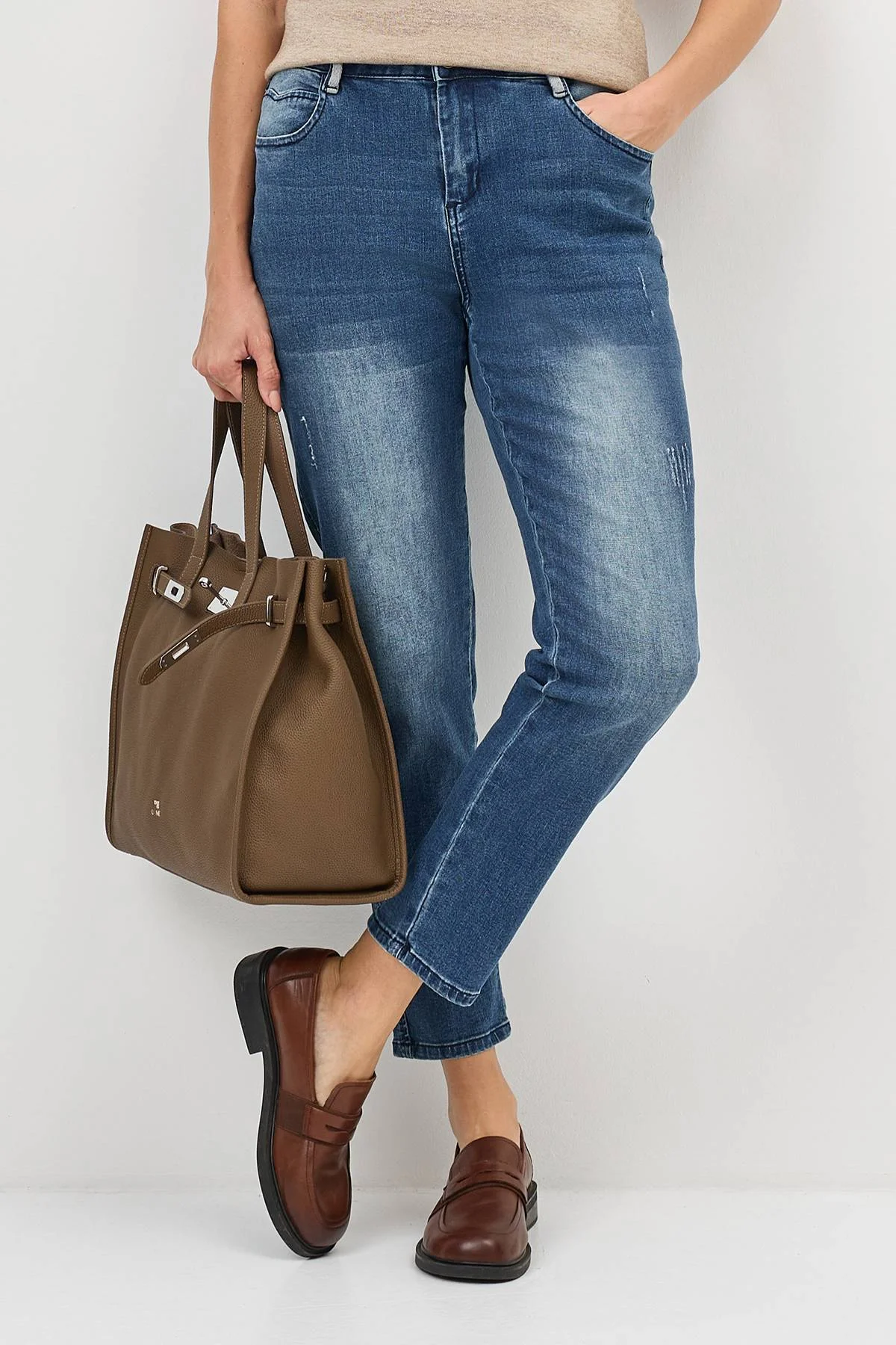 Универсальный прямой крой с мягким сужением книзу создает аккуратный повседневный силуэт. Деликатная варка и декоративная тесьма на шлёвках добавляют модели стильные детали. Эластичный материал обеспечивает комфорт и сохраняет форму в течение дня.