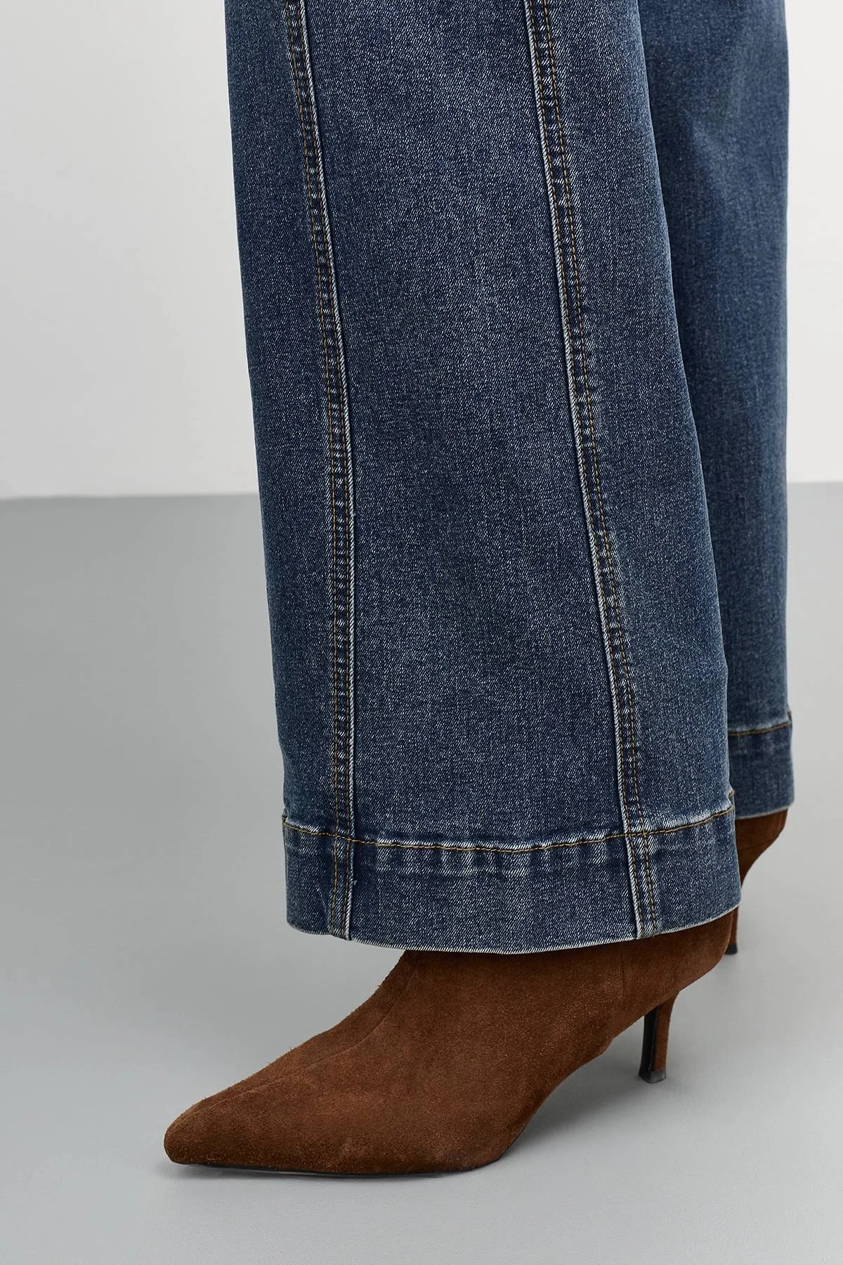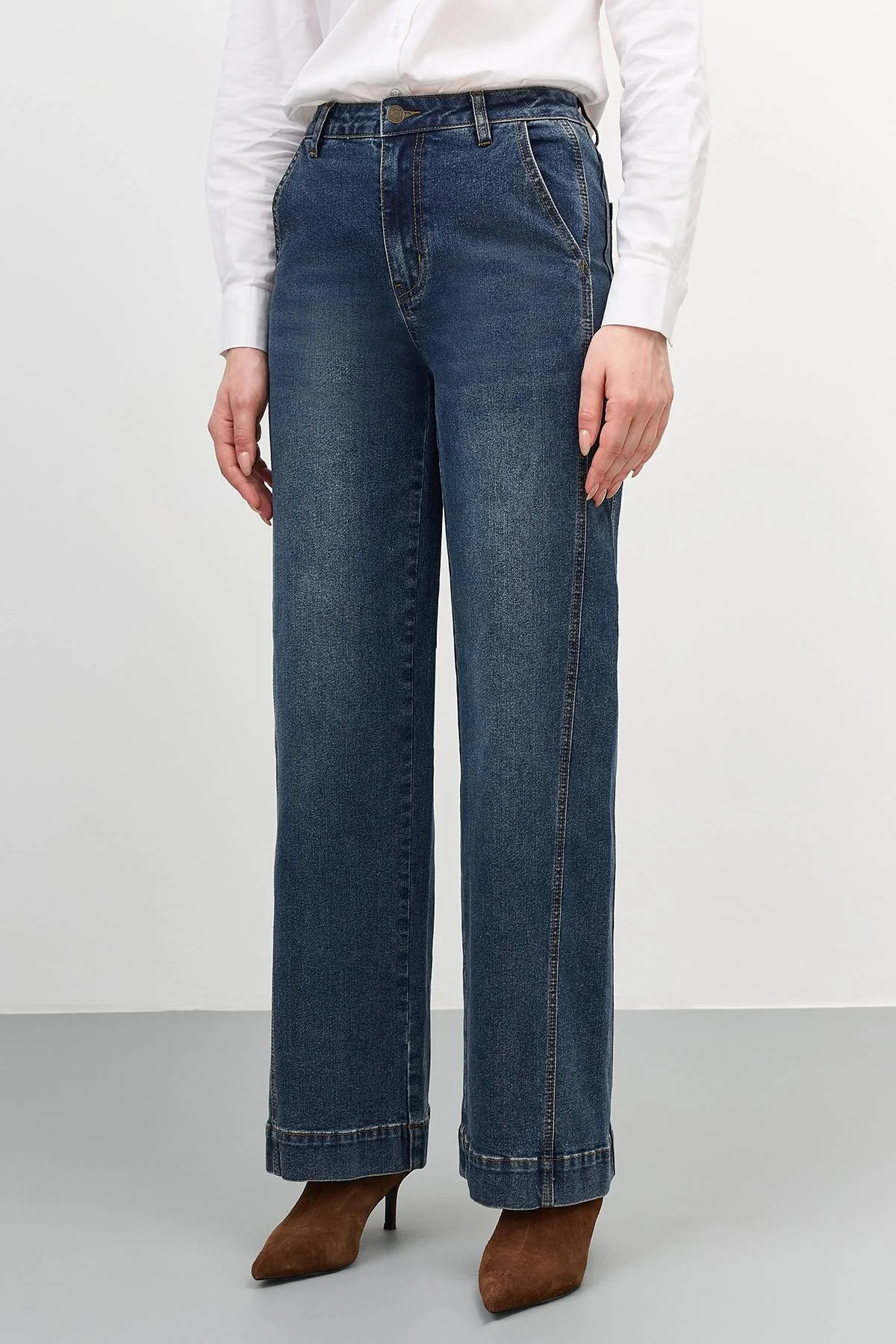 Широкие джинсы с акцентными рельефами по боковым швам. Прямой силуэт немного расширен к низу. Застежка на молнию и металлическую пуговицуу. Четыре кармана. В составе спандекс.