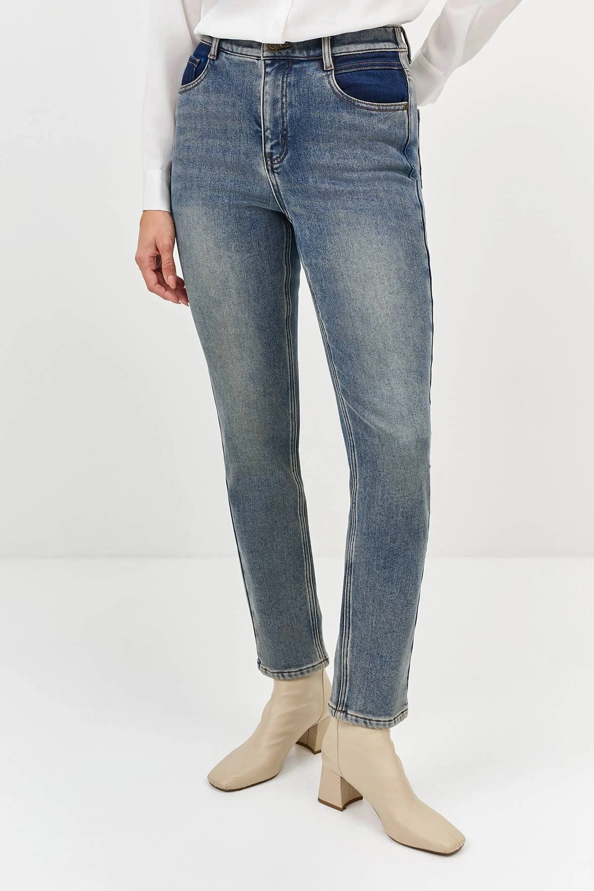 Утепленные джинсы с контрастными карманами. Зауженный силуэт. Застежка на молнию и металлическую пуговицу. Пять карманов. Резинка по линии талии сзади. В составе спандекс.